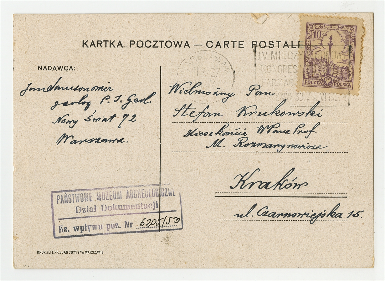 Kartka pocztowa od Jana Samsonowicza do Stefana Krukowskiego z dnia 11 V 1927 roku - awers