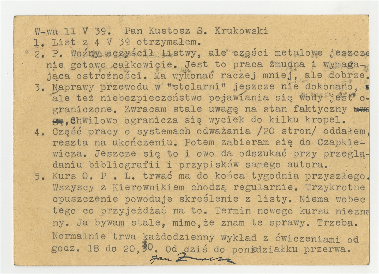 Kartka pocztowa od Jana Żurka do Stefana Krukowskiego z dnia 11 V [19]39 roku - rewers