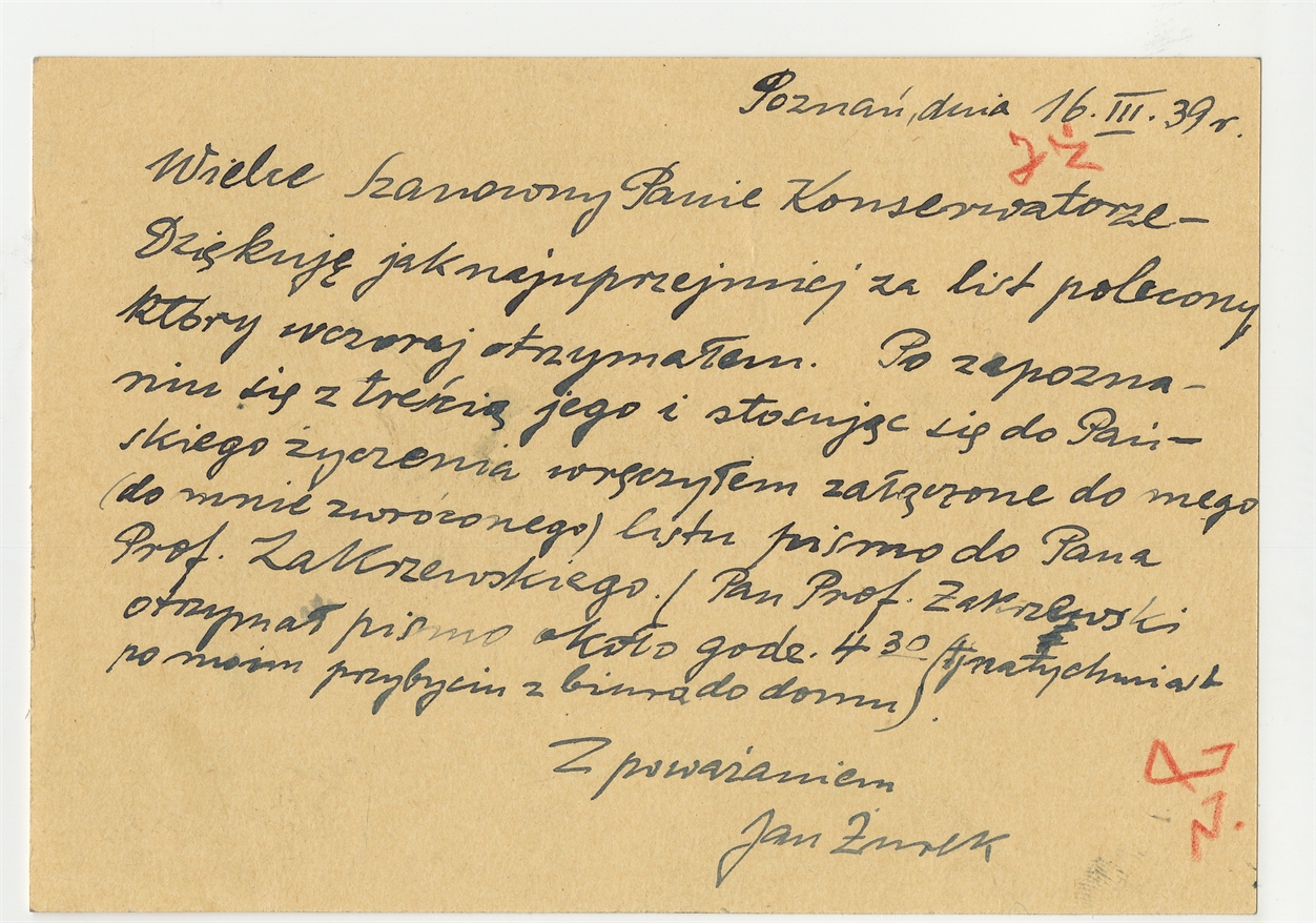 Kartka pocztowa od Jana Żurka do Stefana Krukowskiego z dnia 16 III [19]39 roku - rewers
