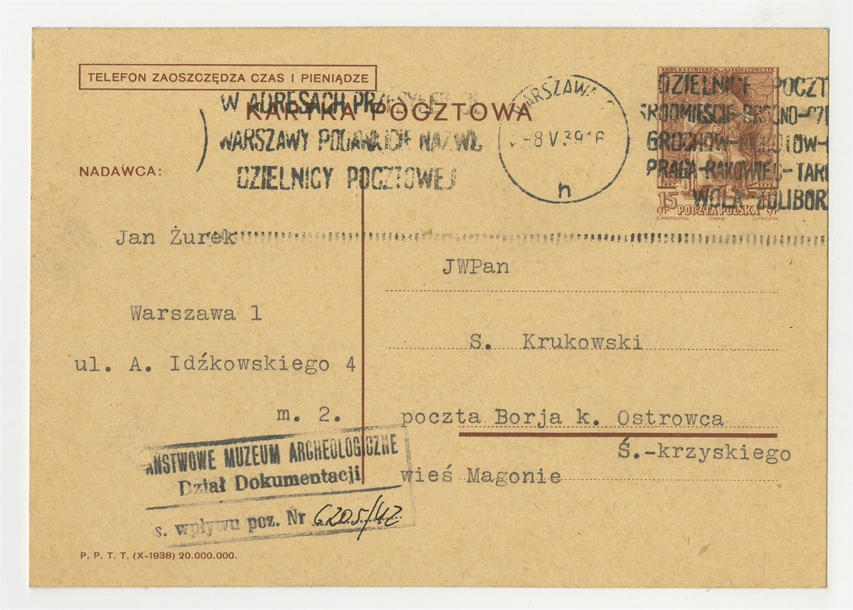 Kartka pocztowa od Jana Żurka do Stefana Krukowskiego z dnia 8 V [19]39 roku - awers