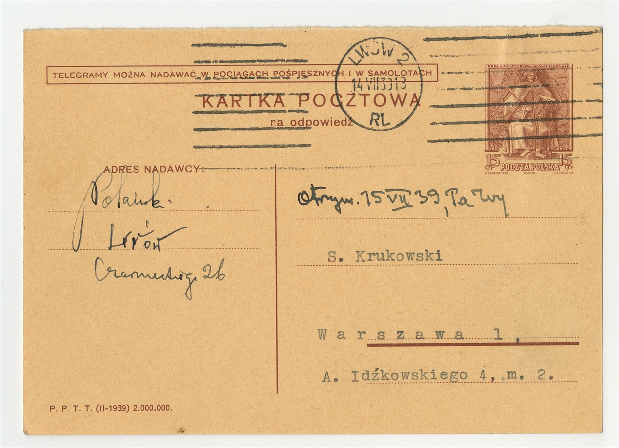Kartka pocztowa od Jerzego Polańskiego do Stefana Krukowskiego z dnia 14 VII [19]39 roku - awers