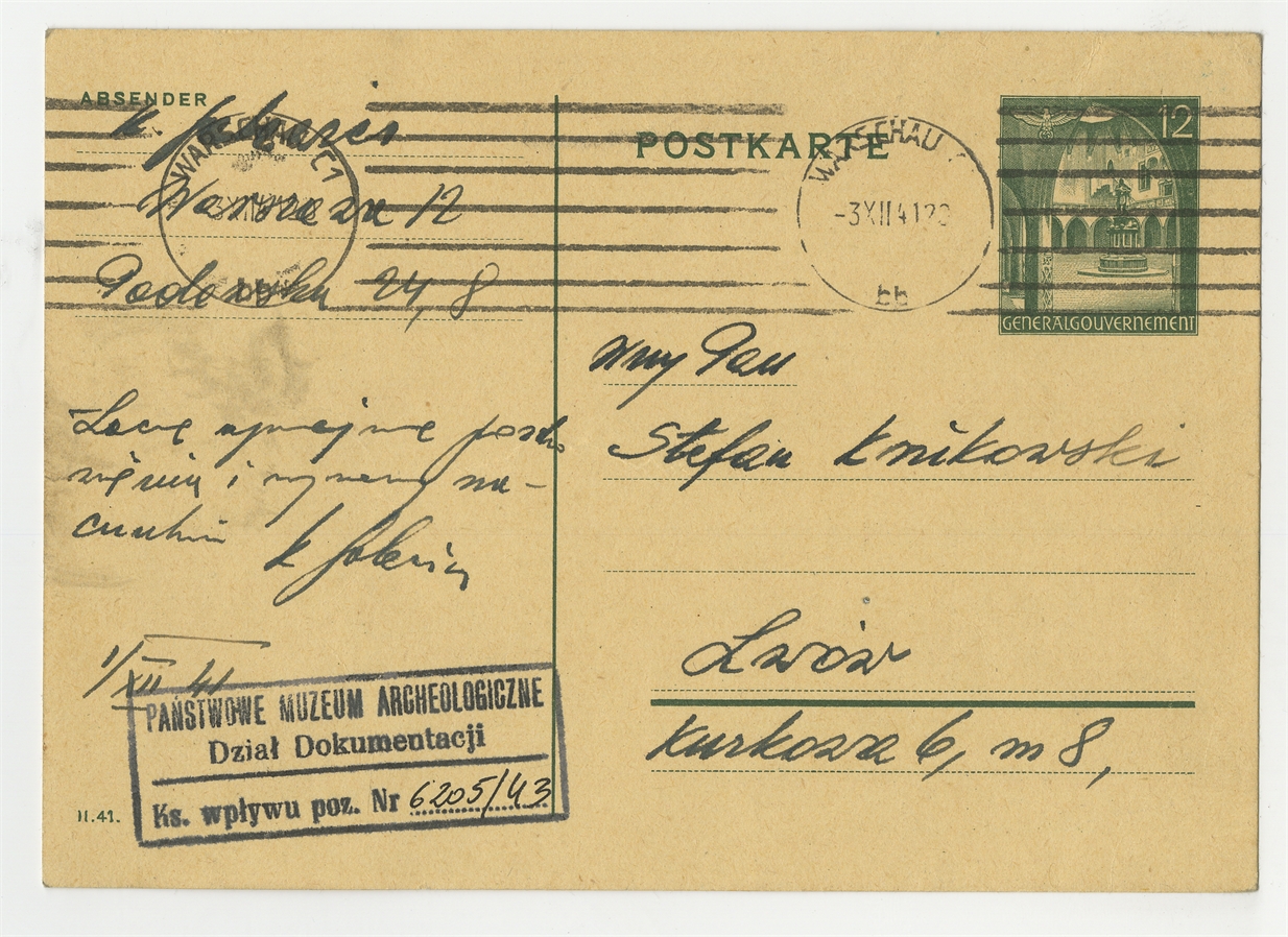 Kartka pocztowa od Kazimierza Salewicza do Stefana Krukowskiego z dnia 1 XII [19]41 roku - awers