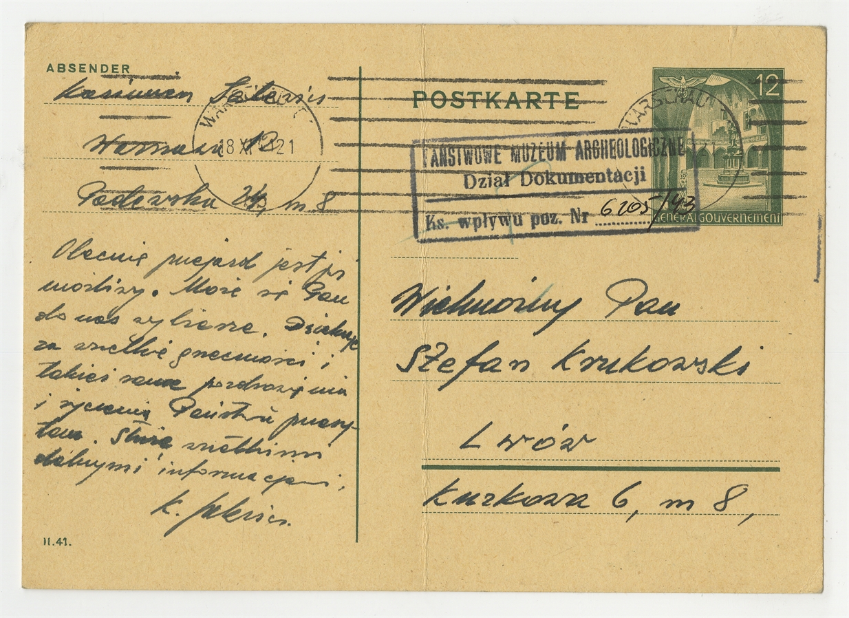 Kartka pocztowa od Kazimierza Salewicza do Stefana Krukowskiego z dnia 18 XI [19]41 roku - awers