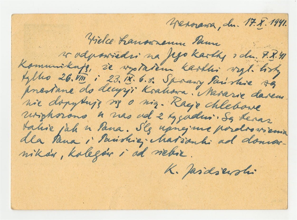 Kartka pocztowa od Konrada Jażdżewskiego do Stefana Krukowskiego z dnia 17 X 1941 roku - rewers