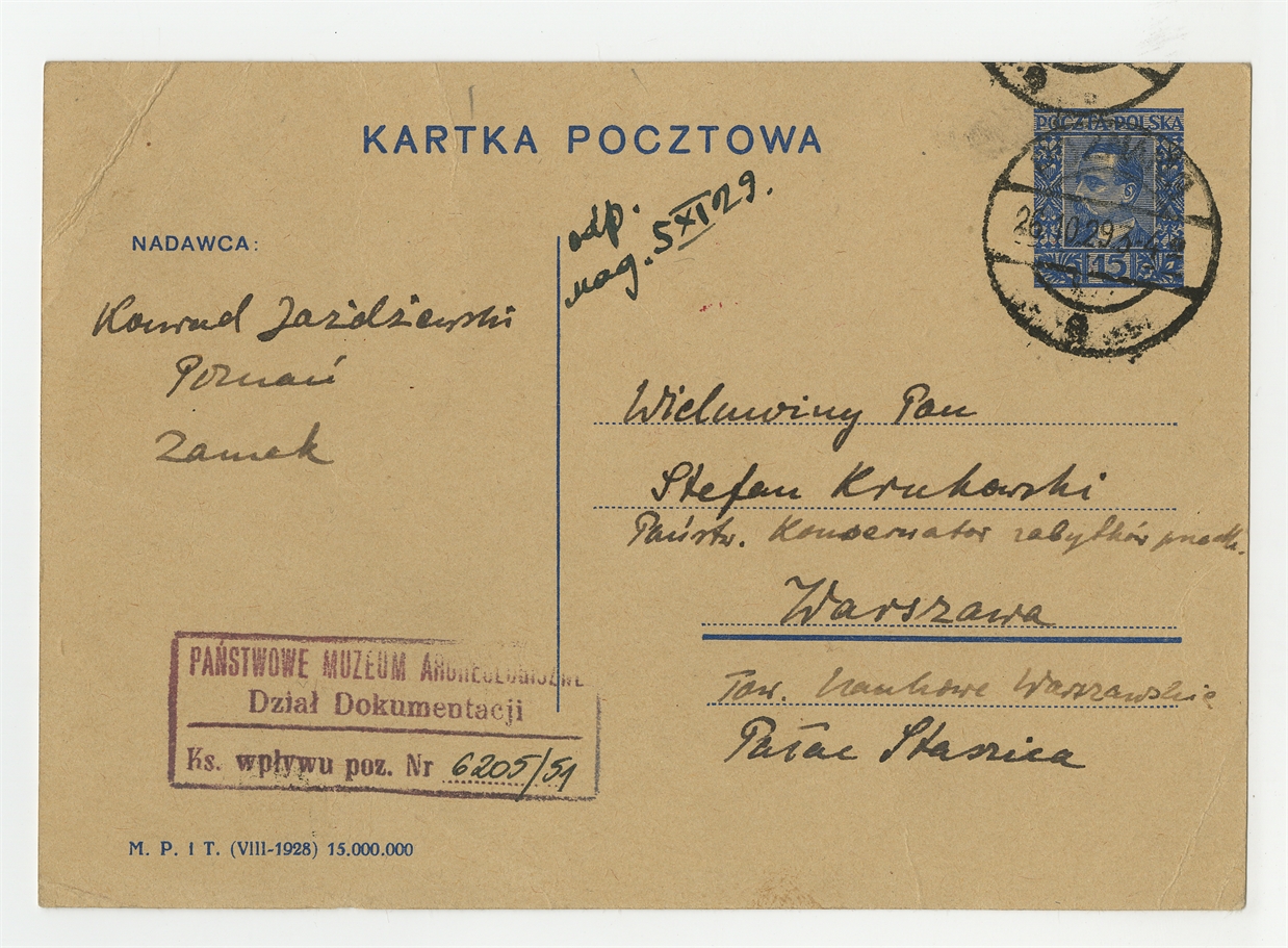 Kartka pocztowa od Konrada Jażdżewskiego do Stefana Krukowskiego z dnia 26 X 1929 roku - awers