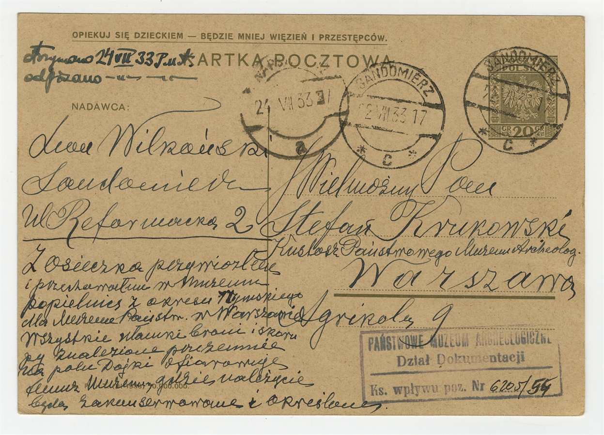 Kartka pocztowa od Leona Wilczańskiego do Stefana Krukowskiego z dnia 22 VII [1]933 roku - awers