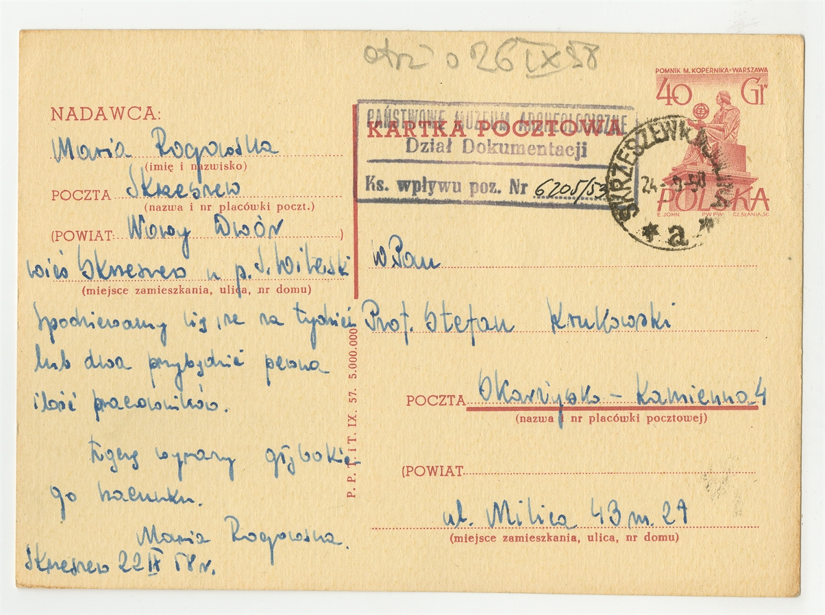Kartka pocztowa od Marii Rogowskiej do Stefana Krukowskiego z dnia 22 IX 1958 roku - awers