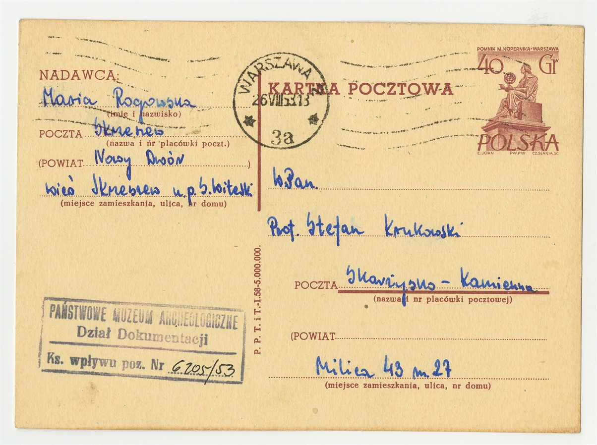 Kartka pocztowa od Marii Rogowskiej do Stefana Krukowskiego z dnia 24 VIII 1958 roku - awers