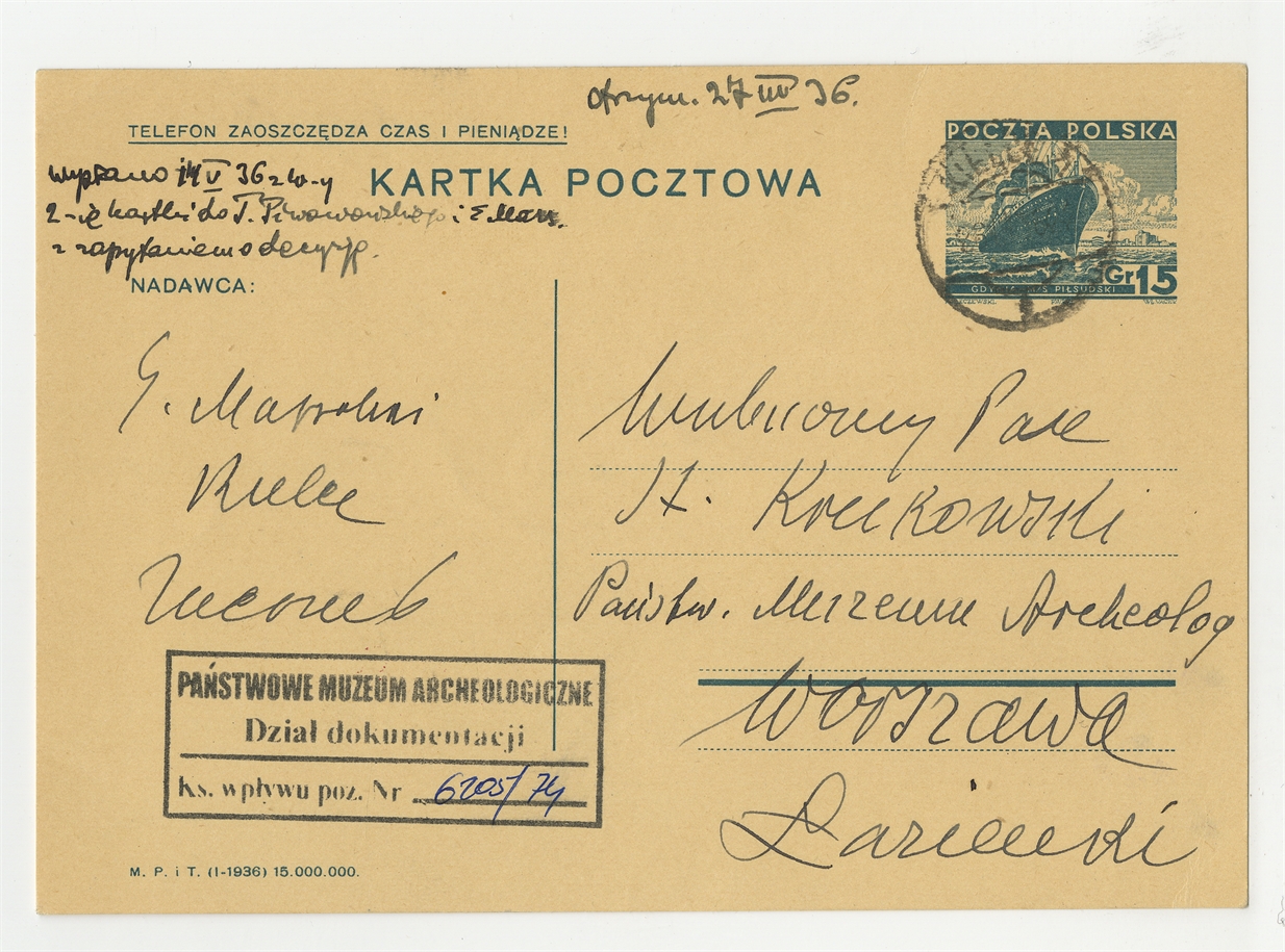 Kartka pocztowa od NN (podpis nieczytelny) do Stefana Krukowskiego z dnia 27 III 1936 roku - awers