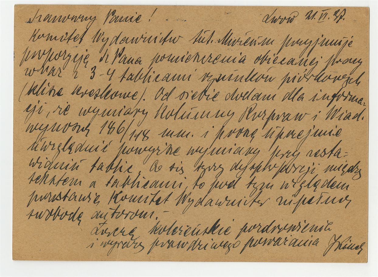 Kartka pocztowa od NN (podpis nieczytelny) ze Lwowa i z pieczątką Muzeum imienia Dzieduszyckich we Lwowie do Stefana Krukowskiego z dnia 21 VI [19]27 roku - rewers