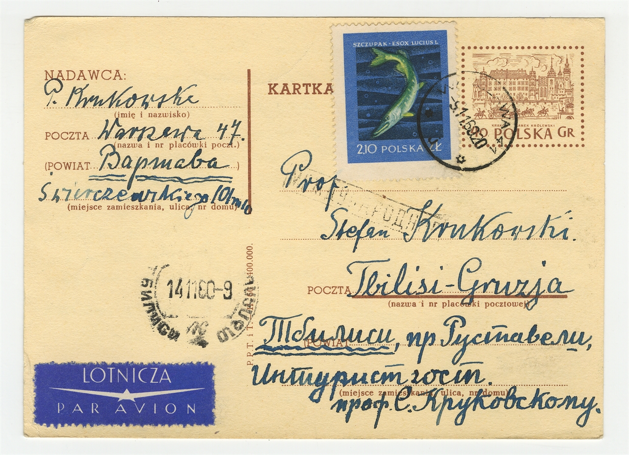 Kartka pocztowa od Pelagii Krukowskiej do Stefana Krukowskiego z dnia 9 XI [19]60 roku - awers