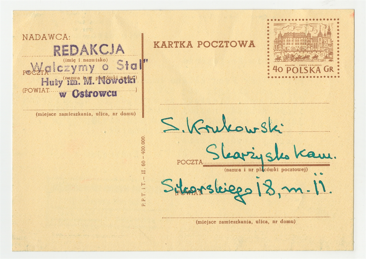 Kartka pocztowa od Redakcji "Walczymy o Stal" do Stefana Krukowskiego z dnia 19.9.[19]60 roku - awers