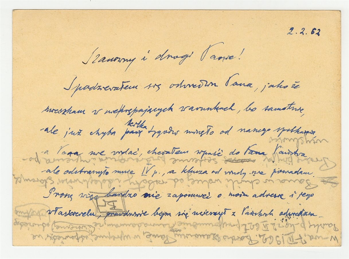 Kartka pocztowa od St..B. Żyranik [?] do Stefana Krukowskiego z dnia 2.2.[19]62 roku. - rewers. Rękopis - brudnopis odpowiedzi S. Krukowskiego z dnia 7 II 1962 na kartkę