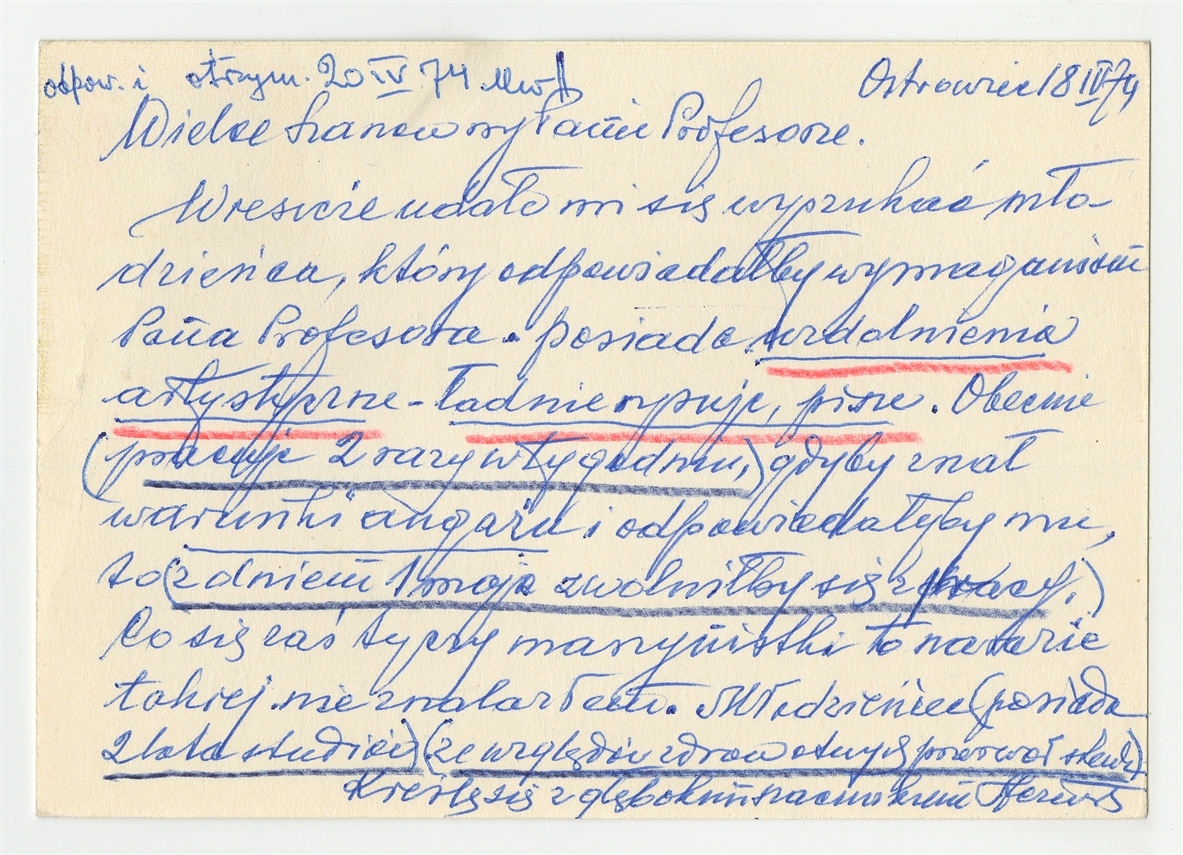 Kartka pocztowa od St. Jeżewskiego do Stefana Krukowskiego z dnia 18 IV [19]74 roku -rewers