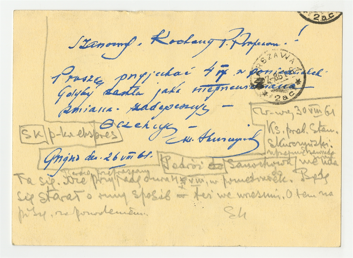 Kartka pocztowa od  Stanisława Skurczyńskiego do Stefana Skurczyńskiego z dnia 26 VIII [19]61 roku - rewers. Ręką S. Krukowskiego brudnopis odpowiedzi z dnia 30 VIII [19}61 roku na tę kartkę.