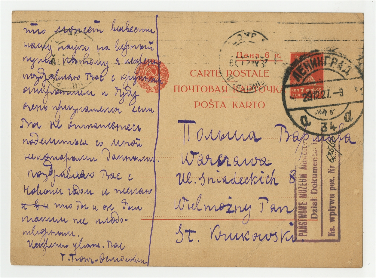 Kartka pocztowa od T. A. Boncz-Osmołowskij do Stefana Krukowskiego z dn. 27 XII [19]27 r. - awers