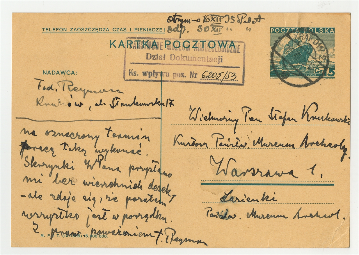 Kartka pocztowa od Tadeusza Reymana do Stefana Krukowskiego z dnia 15 XII [19]35 roku - awers