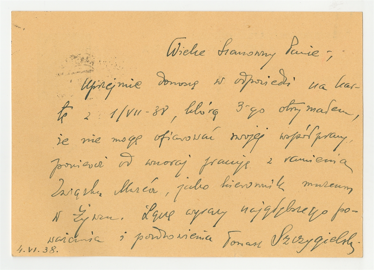 Kartka pocztowa od Tomasza Szczygielskiego do Stefana Krukowskiego z dnia 4 VI [19]38 roku - rewers