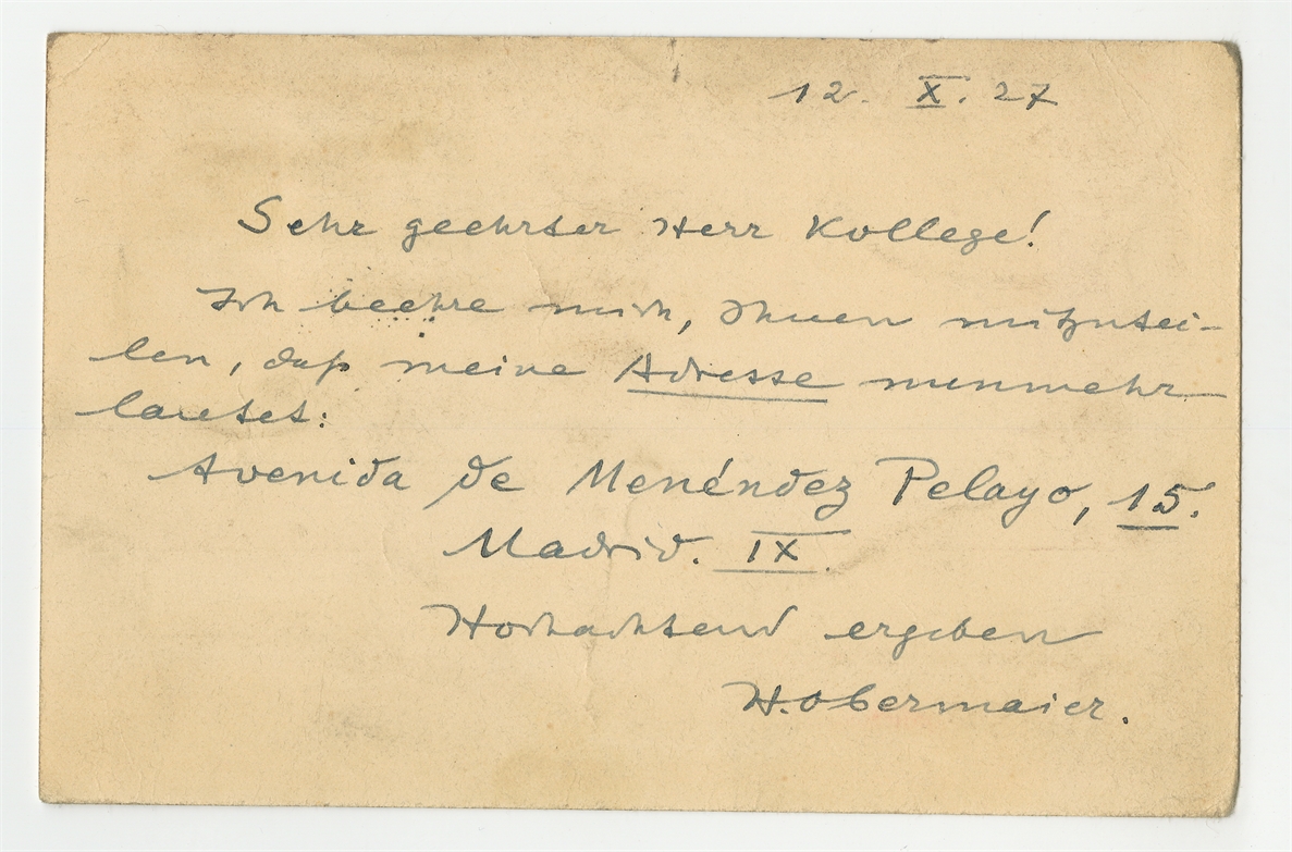 Kartka pocztowa w języku niemieckim od Hugo Obermaiera do Stefana Krukowskiego z dnia 12 X [19]27 roku - rewers