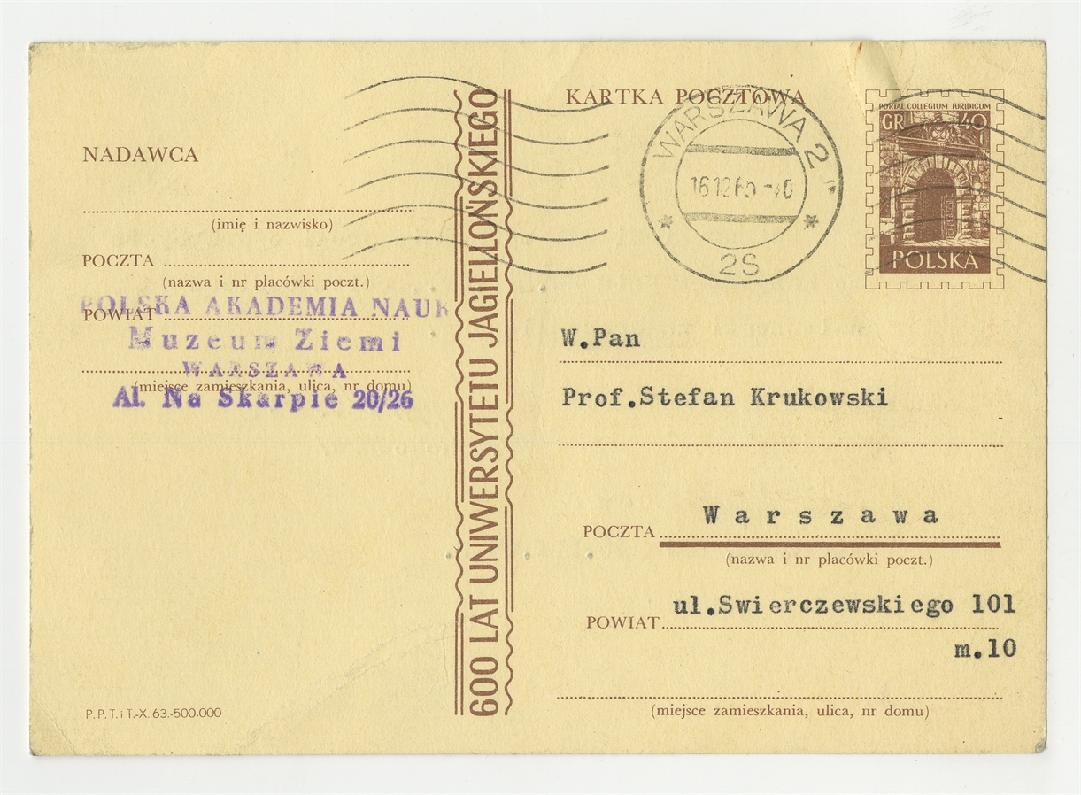 Kartka pocztowa z Muzeum Ziemi PAN do S. Krukowskiego z dn. 16 XII [19]65 r. - awers