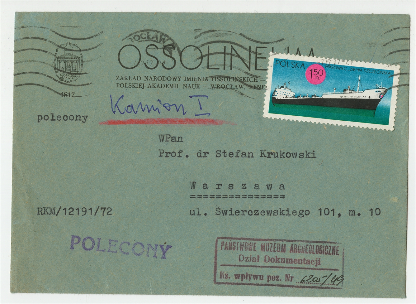 Koperta adresowana do Stefana Krukowskiego - maszynopis z Zakłaadu Narodowego im. Ossolińskich z 1972 r.
