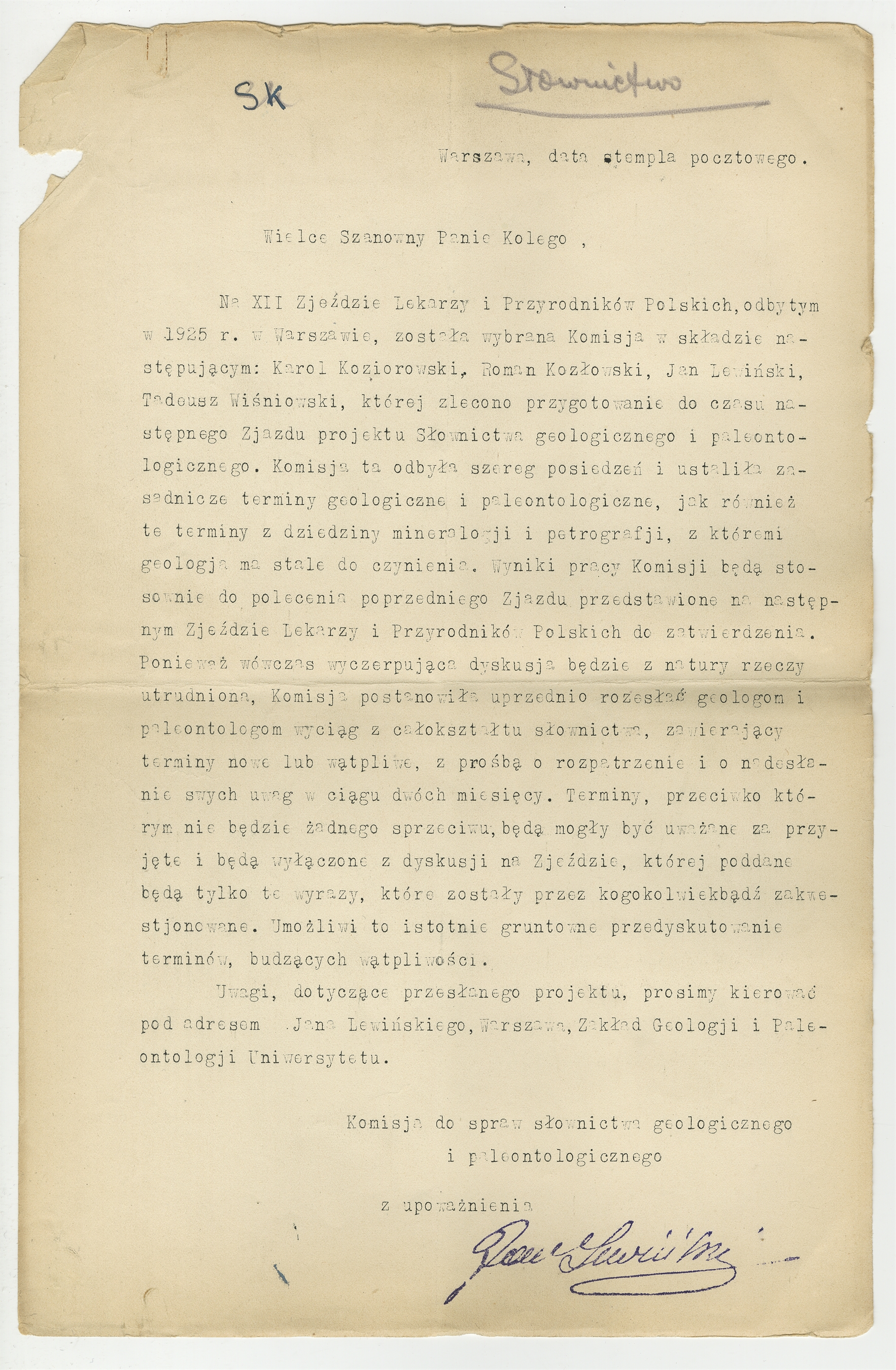 List przewodni przysłany do prof. Stefana Krukowskiego z Komisji do Spraw Słownictwa Geologicznego i Paleontologicznego