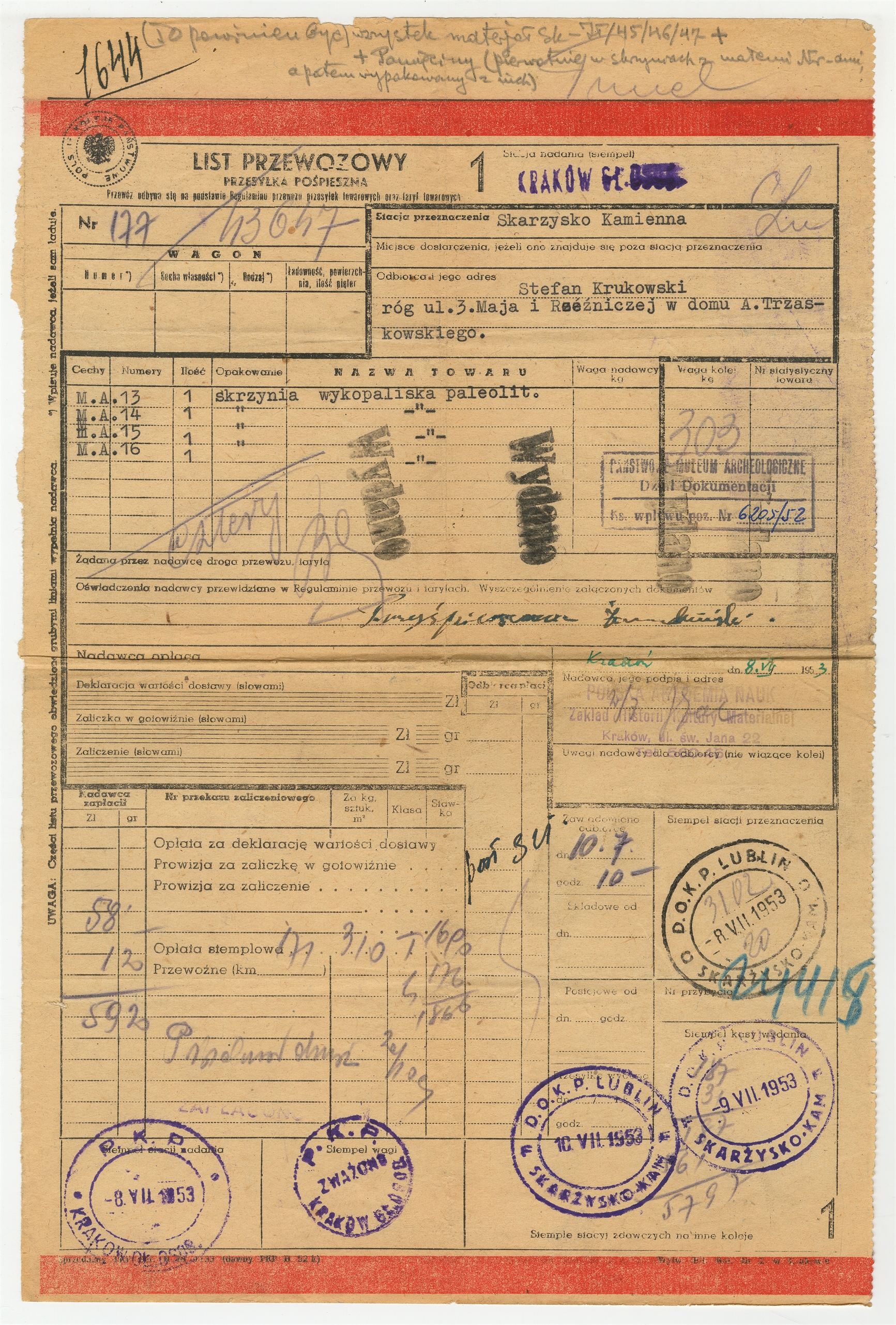 List przewozowy na przesyłkę z Polskiej Akademii Nauk w Krakowie dla Stefana Krukowskiego z dnia 8 VII 1953 roku. Notatka ręką Stefana Krukowskiego dotycząca przesyłki