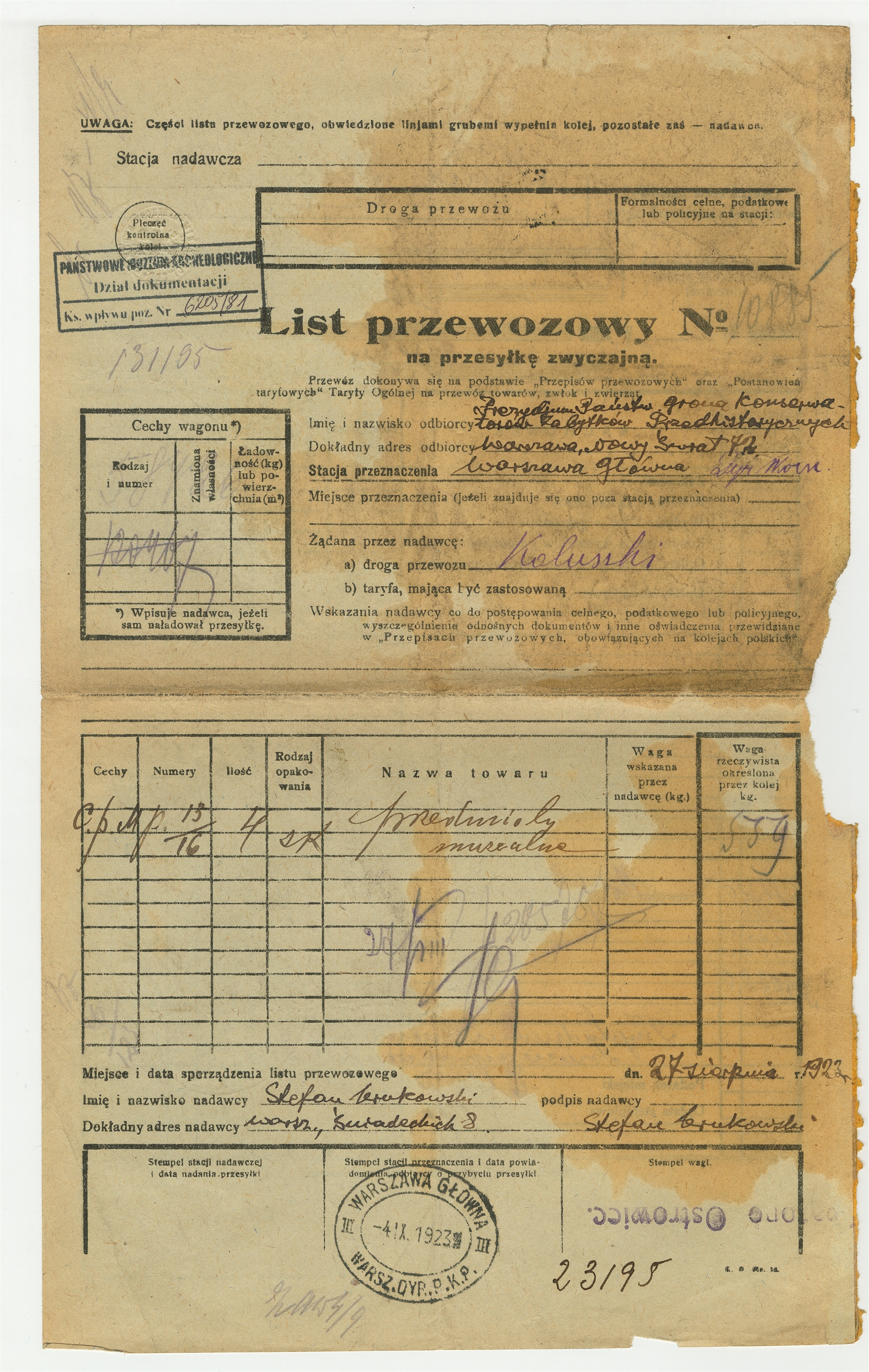 List przewozowy nr 10885 z dnia 27 VIII 1923 roku na przesyłkę z przedmiotami muzealnymi ze stacji Ostrowiec do Warszawy - strona 1