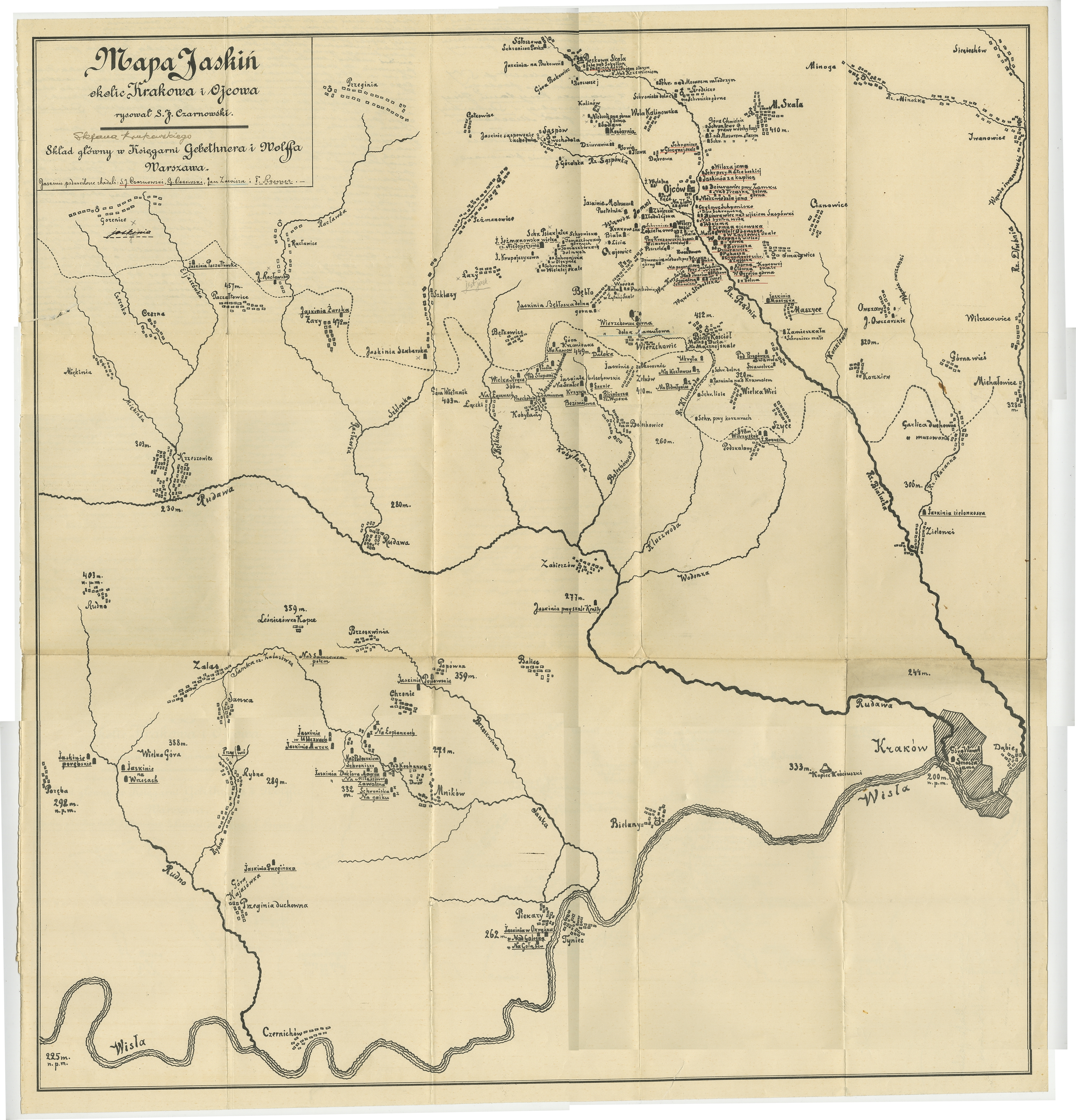 Mapa autorstwa S. J. Czarnowskiego pt. "Mapa Jaskiń okolic Krakowa i Ojcowa" z publikacji S.J. Czarnowskiego z odręcznym wypisem Stefana Krukowskiego na temat Wąwozu Jamki - strona 1: mapa