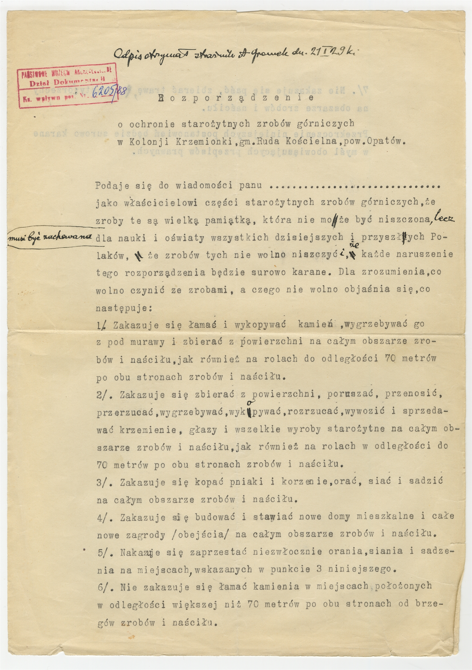 Maszynopis - brudnopis "Rozporządzenie o ochronie starożytnych zrobów górniczych w Kolonji Krzemionki gm. Ruda Kościelna pow. Opatów" - strona 1: pkt. 1-6