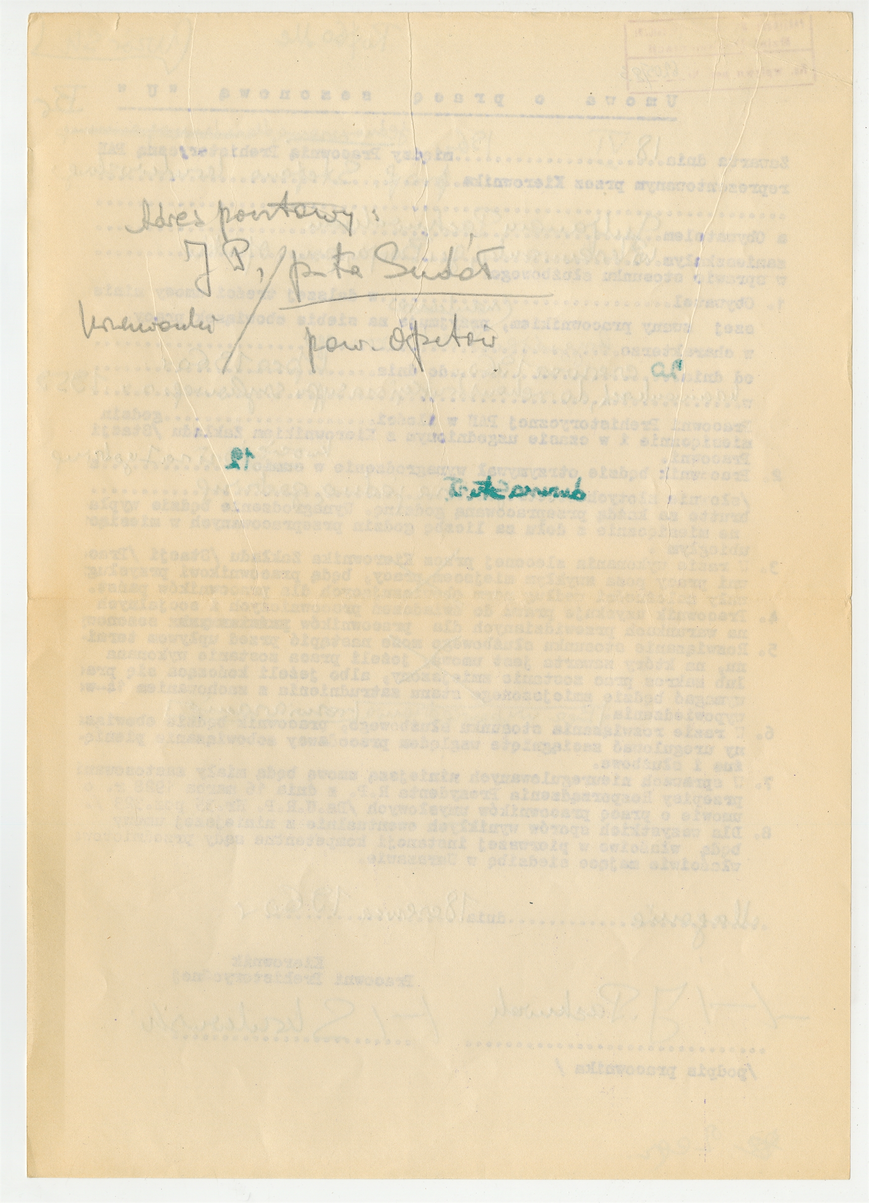 Maszynopis - brudnopis umowy o prace sezonową z dnia 18 czerwca 1960 roku pomiędzy Stefanem Krukowskim a Juljanem Pachniakiem - notatka ręką S. Krukowskiego z adresem J. P.