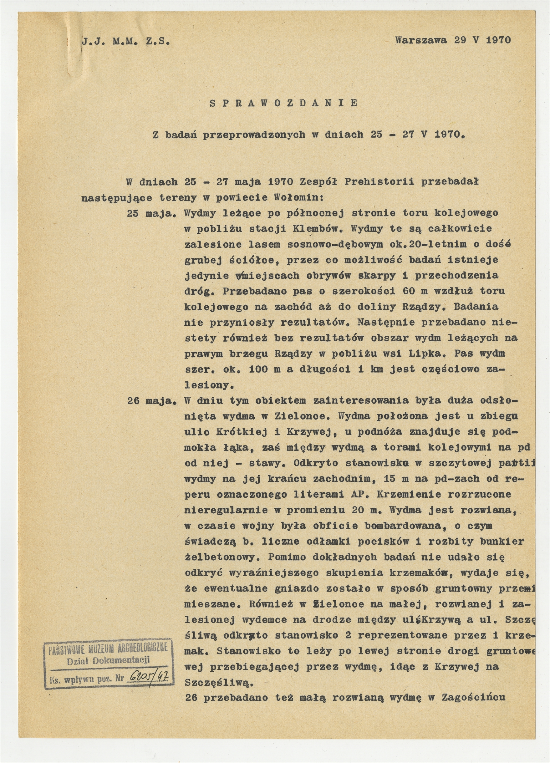 Maszynopis dokumentu pt. "Sprawozdanie. Z badań przeprowadzonych w dniach 25 - 27 V 1970" opatrzony inicjałami J.J. (Jolanta Janiec?) M.M. (Marek Młynarski?) oraz Z.S. (Zofia Sulgostowska?) Warszawa 29 V 1970 r. - strona 1: "W dniach 25 - 27 maja 1970 (…)"