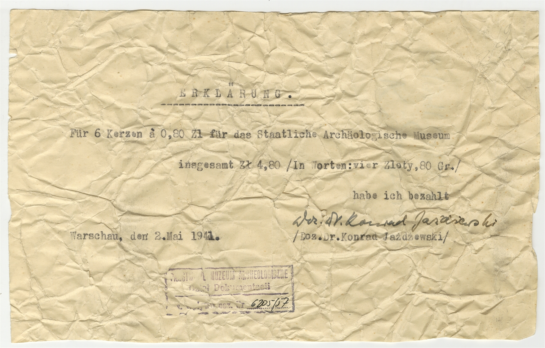 Maszynopis - Erklärung z dnia 2 maja 1941 wystawiony przez Konrada Jażdżewskiego dla Staatliche Archäologische Museum