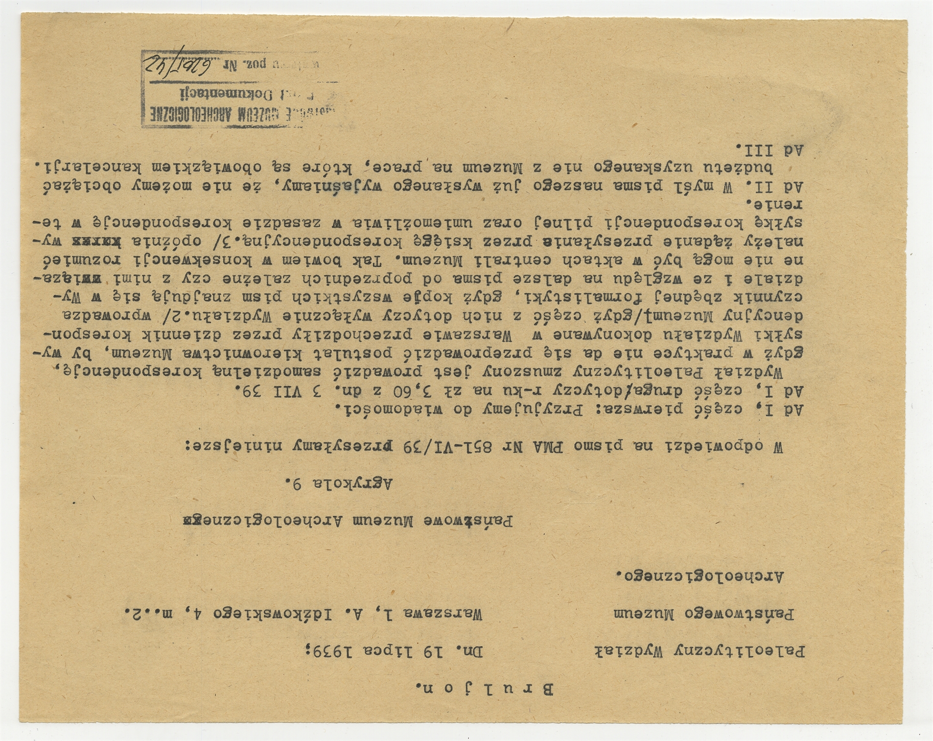 Maszynopis - fragment listu Paleolitycznego Wydziału PMA do Państwowego Muzeum Archeologicznego z dnia 19 lipca 1940
