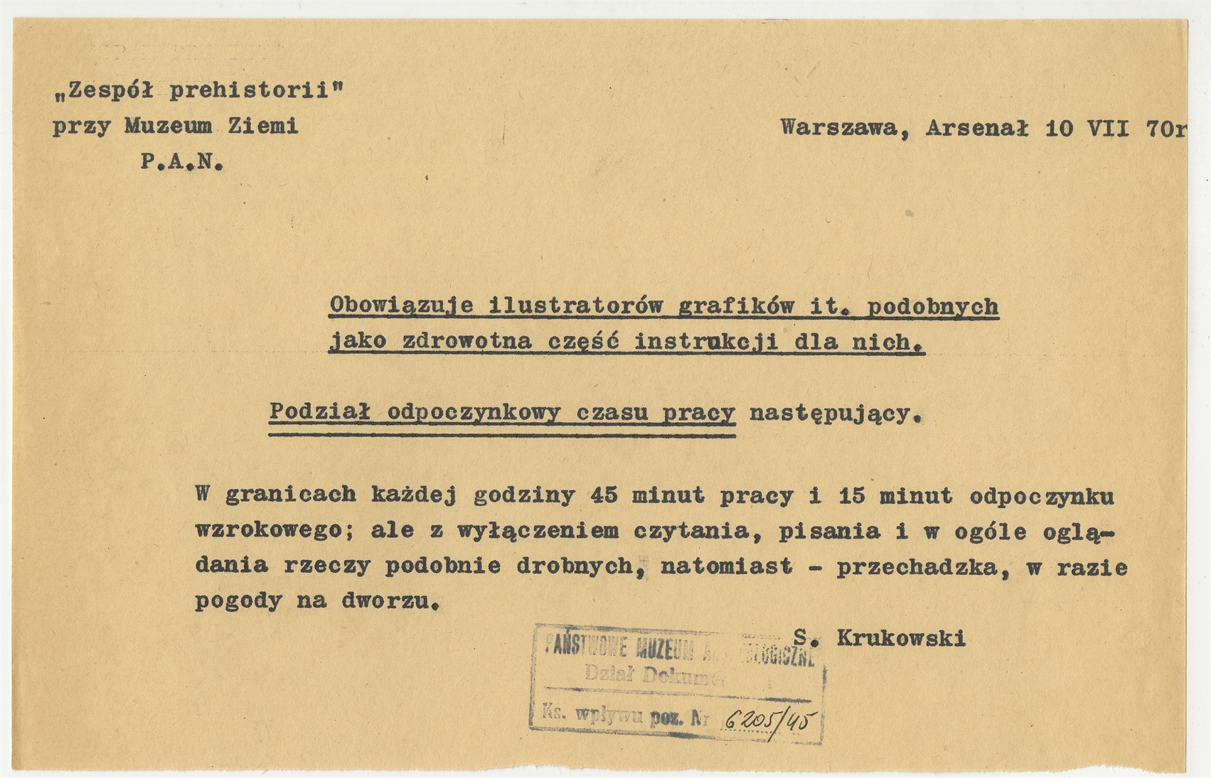 Maszynopis instrukcji zdrowotnej S. Krukowskiego dla "ilustratorów grafików it. Podobnych" - strona 1: "W granicach każdej godziny" … "w razie pogody na dworzu" Warszawa Arsenał 10 VII [19]70