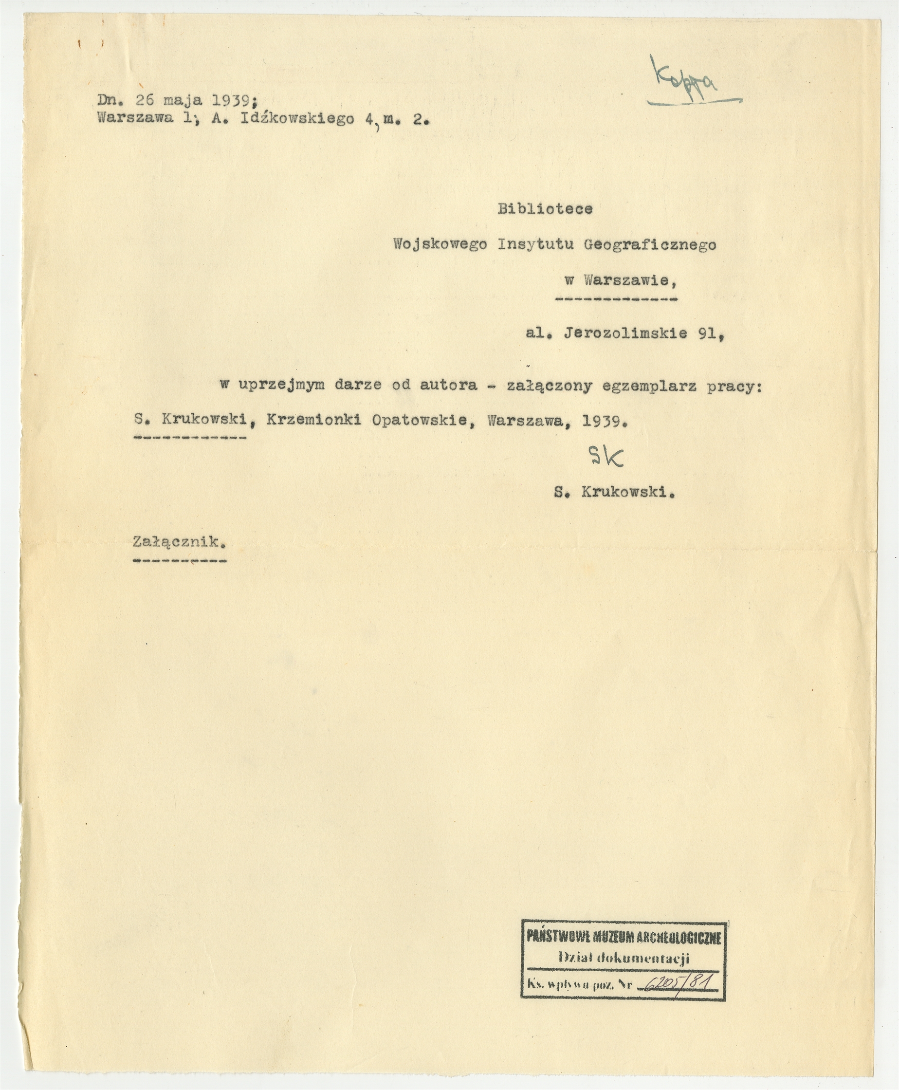 Maszynopis - kopia listu Stefana Krukowskiego do Biblioteki Wojskowego Instytutu Geograficznego z dnia 26 maja 1939 roku