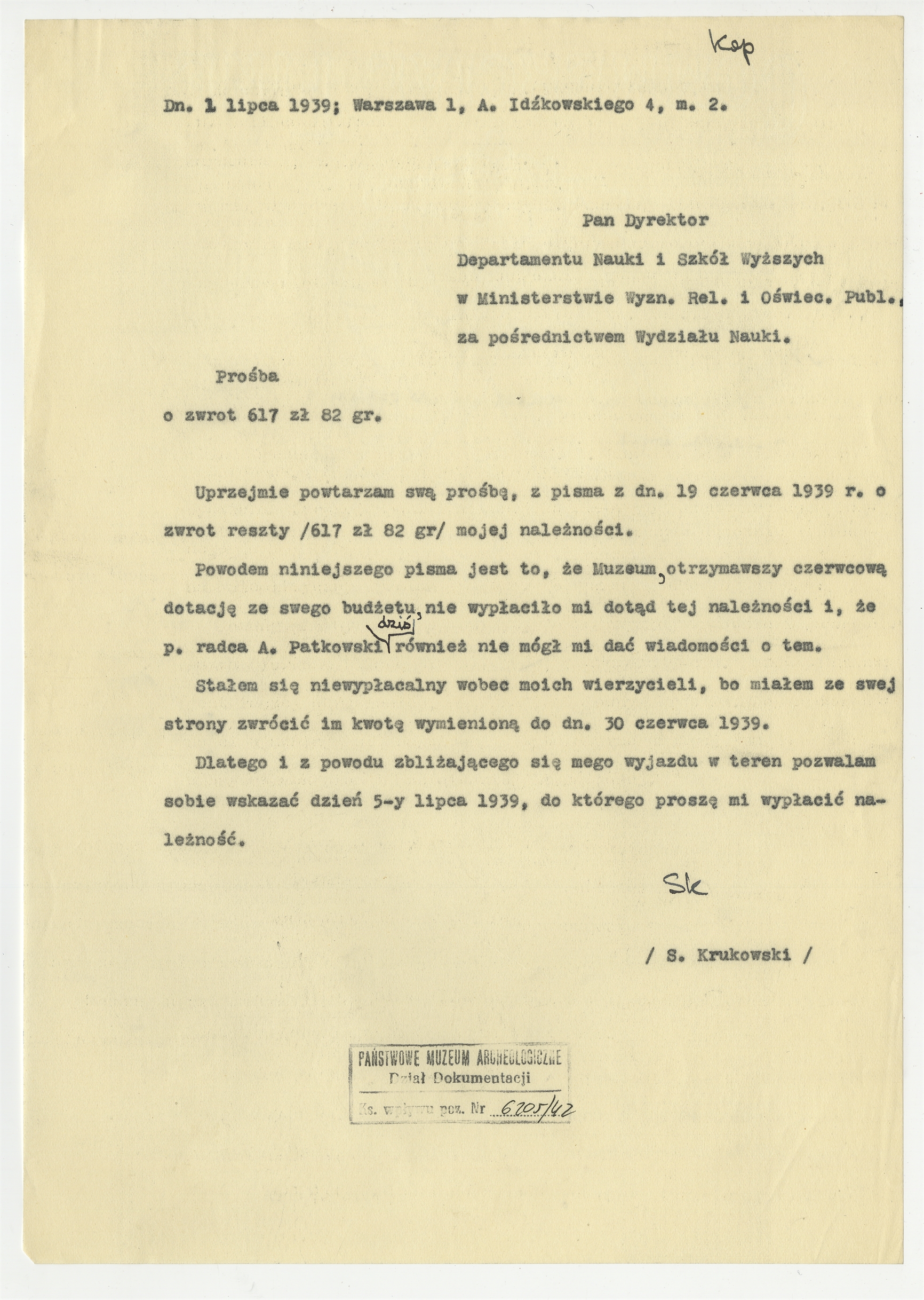Maszynopis - kopia listu Stefana Krukowskiego do Dyrektora Departamentu Nauki i Szkół Wyższych w Ministerstwie W.R. i O.P. z dnia 1 lipca 1939 roku