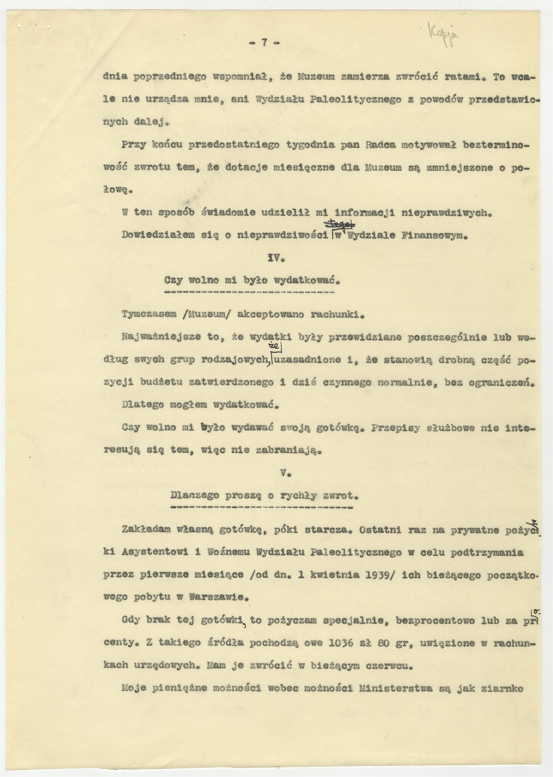 Maszynopis - kopia listu Stefana Krukowskiego do Dyrektora Departamentu Nauki i Szkół Wyższych w Ministerstwie W.R. i O.P z dnia 12 czerwca 1939 roku w sprawie zwrotu gotówki. Strona 7