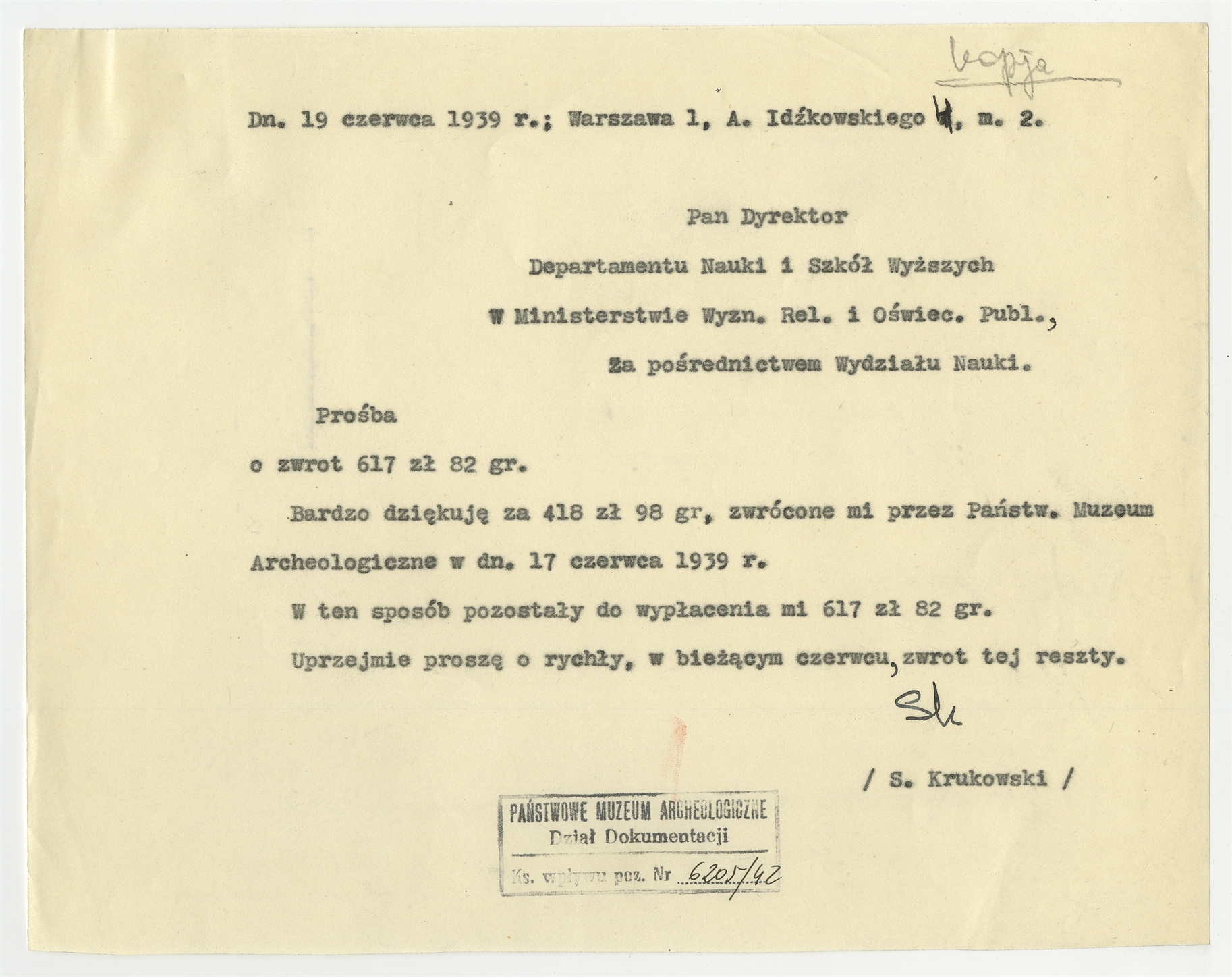 Maszynopis - kopia listu Stefana Krukowskiego do Dyrektora Departamentu Nauki i Szkół Wyższych w Ministerstwie W.R. i O.P z dnia 19 czerwca 1939 roku