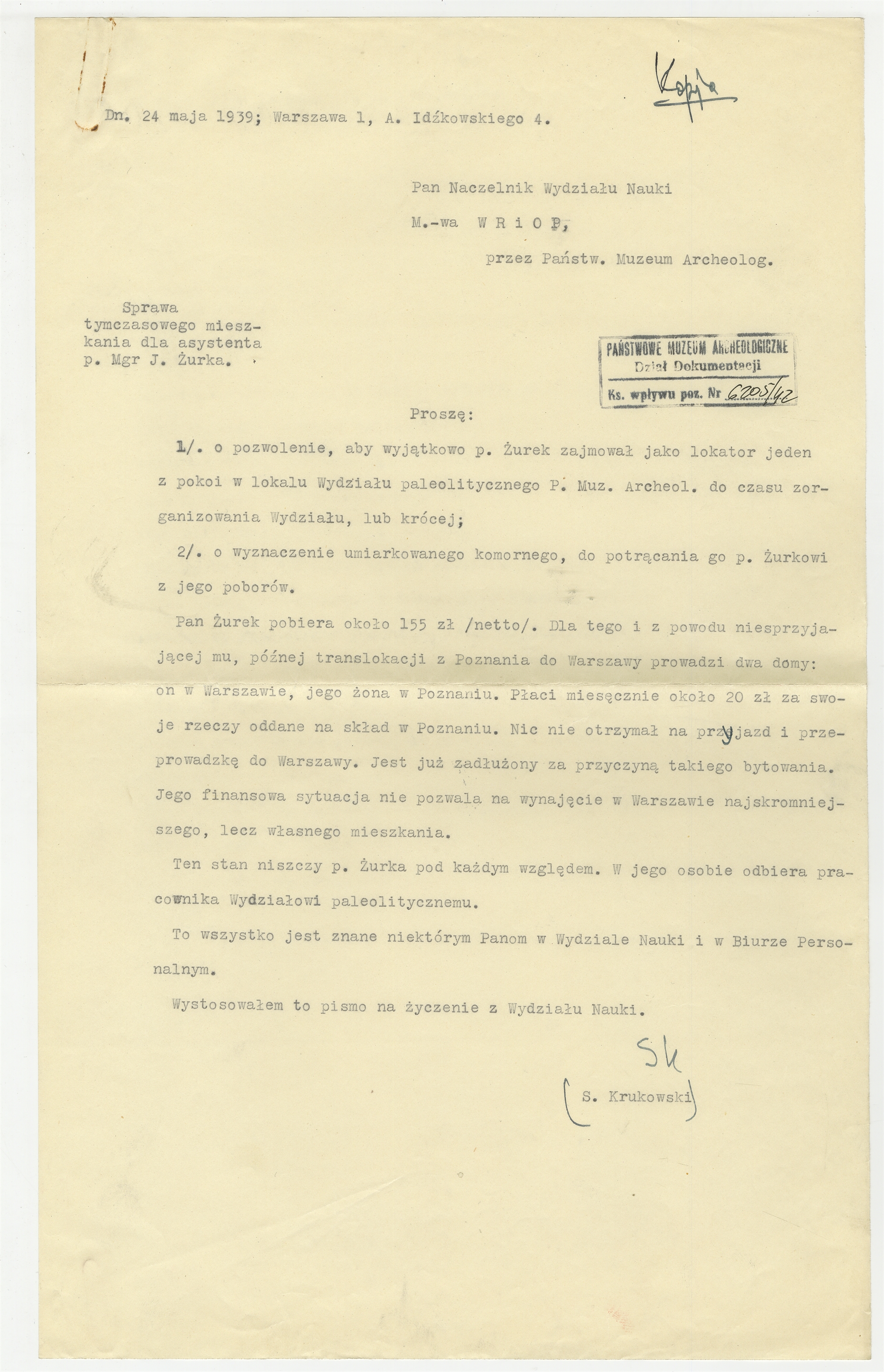 Maszynopis - kopia listu Stefana Krukowskiego do Naczelnika Wydziału Nauki Ministerstwa W.R. i O.P. z dnia 24 maja 1939 roku w sprawie mieszkania dla Jana Żurka (kopia dłuższa)