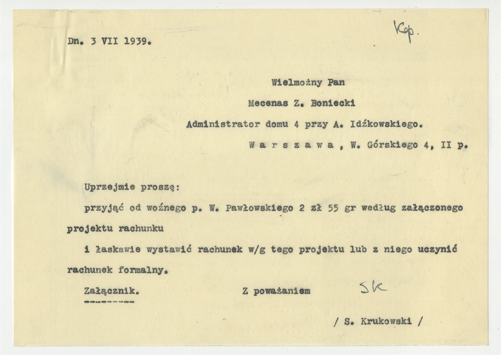 Maszynopis - kopia listu Stefana Krukowskiego do Z. Bonieckiego z dnia 3 VII 1939 roku w sprawie rachunku