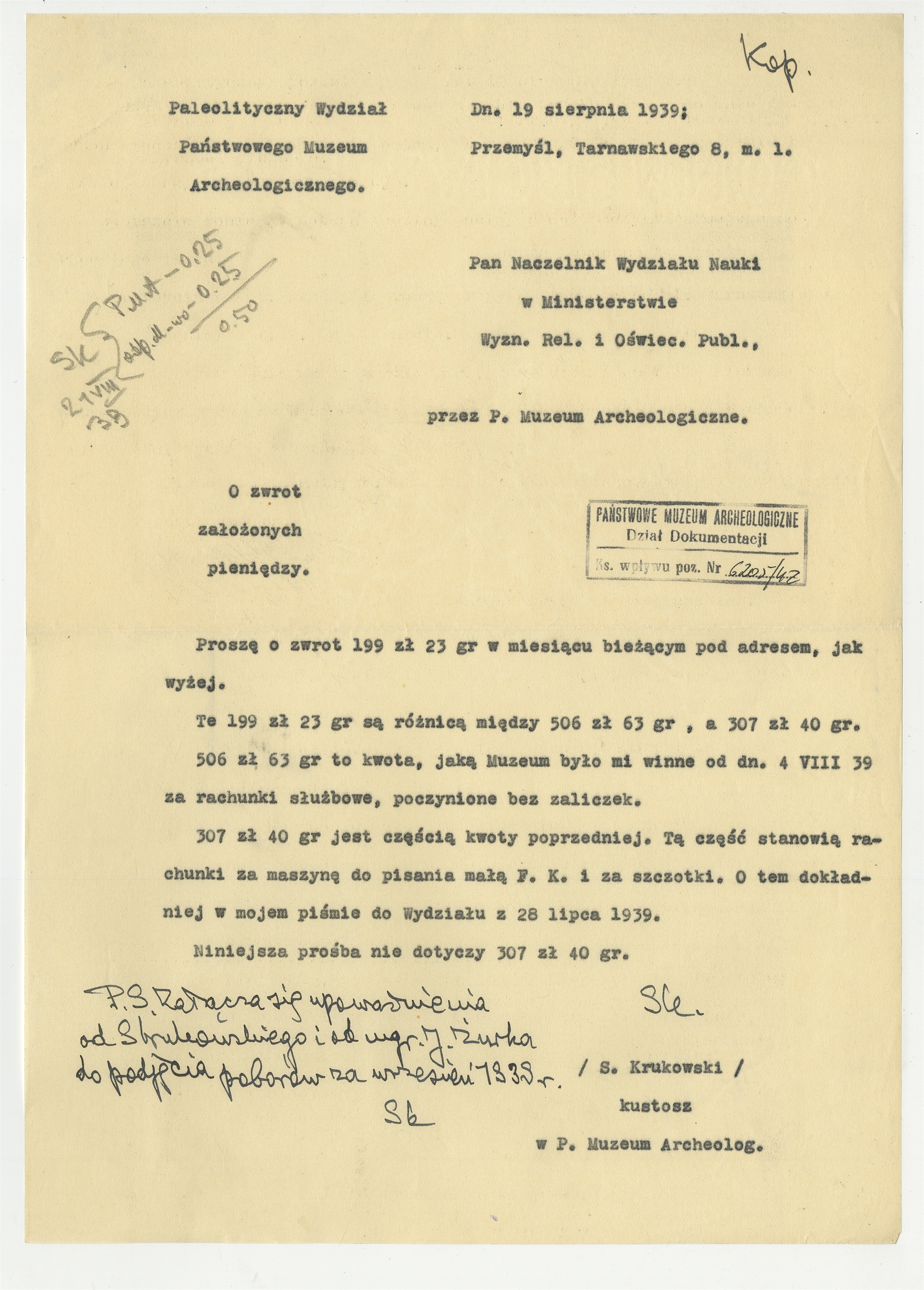 Maszynopis - kopia listu Stefana Krukowskiego z dnia 19 sierpnia 1939 roku do Naczelnika Wydziału Nauki Ministerstwa W.R. i O.P. o zwrot pieniędzy