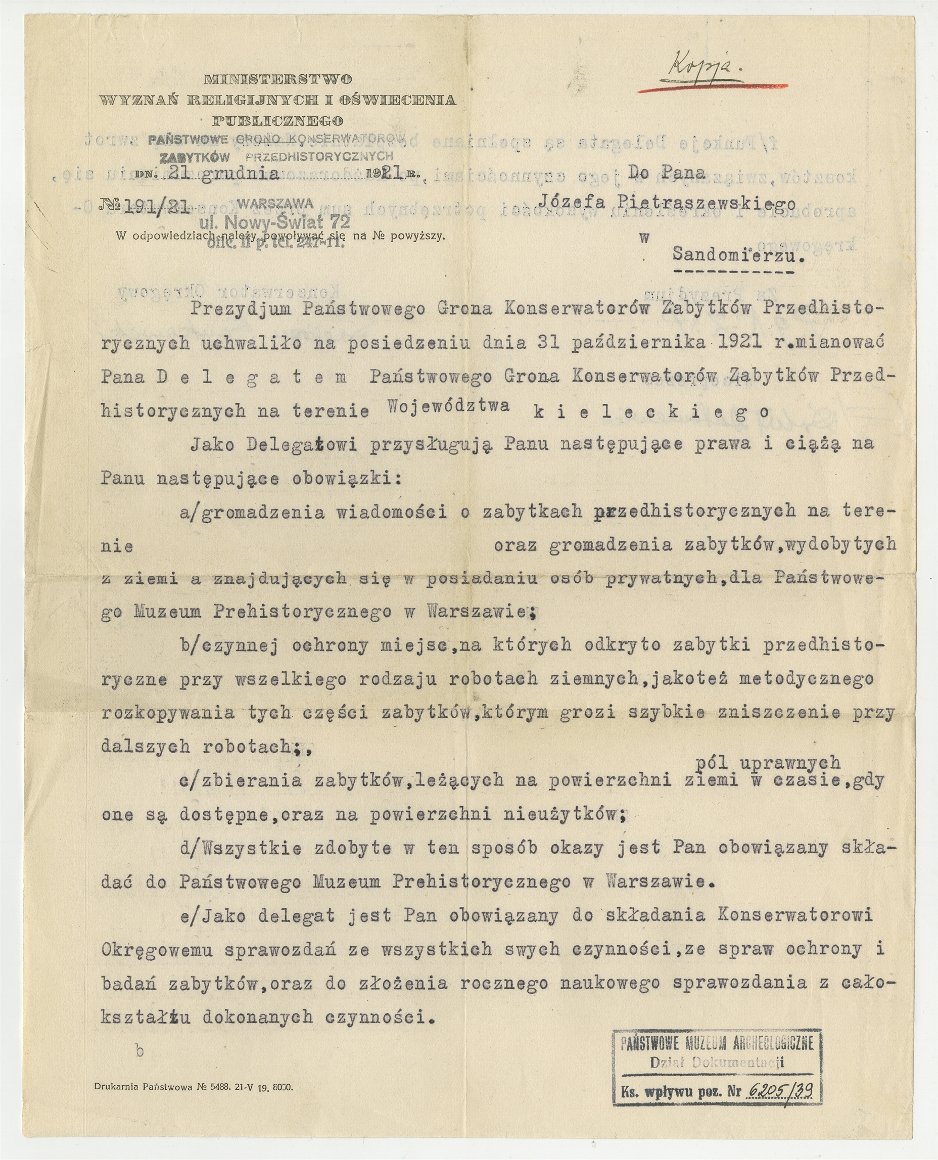Maszynopis - kopia pisma Państwowego Grona Konserwatorów Zabytków Przedhistorycznych (nr 191/21) do Józefa Pietraszewskiego z informacją o mianowaniu go Delegatem PGKZP na terenie województwa kieleckiego Warszawa 21 grudnia 1921 r. - strona 1