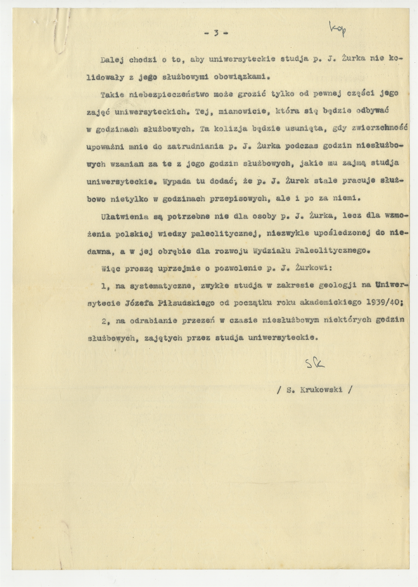 Maszynopis - kopia pisma Stefana Krukowskiego z dnia 10 lipca 1939 roku do Naczelnika Wydziału Nauki Ministerstwa W.R. i O.P. w sprawie zgody na studia geologiczne Jana Żurka (strona 3)