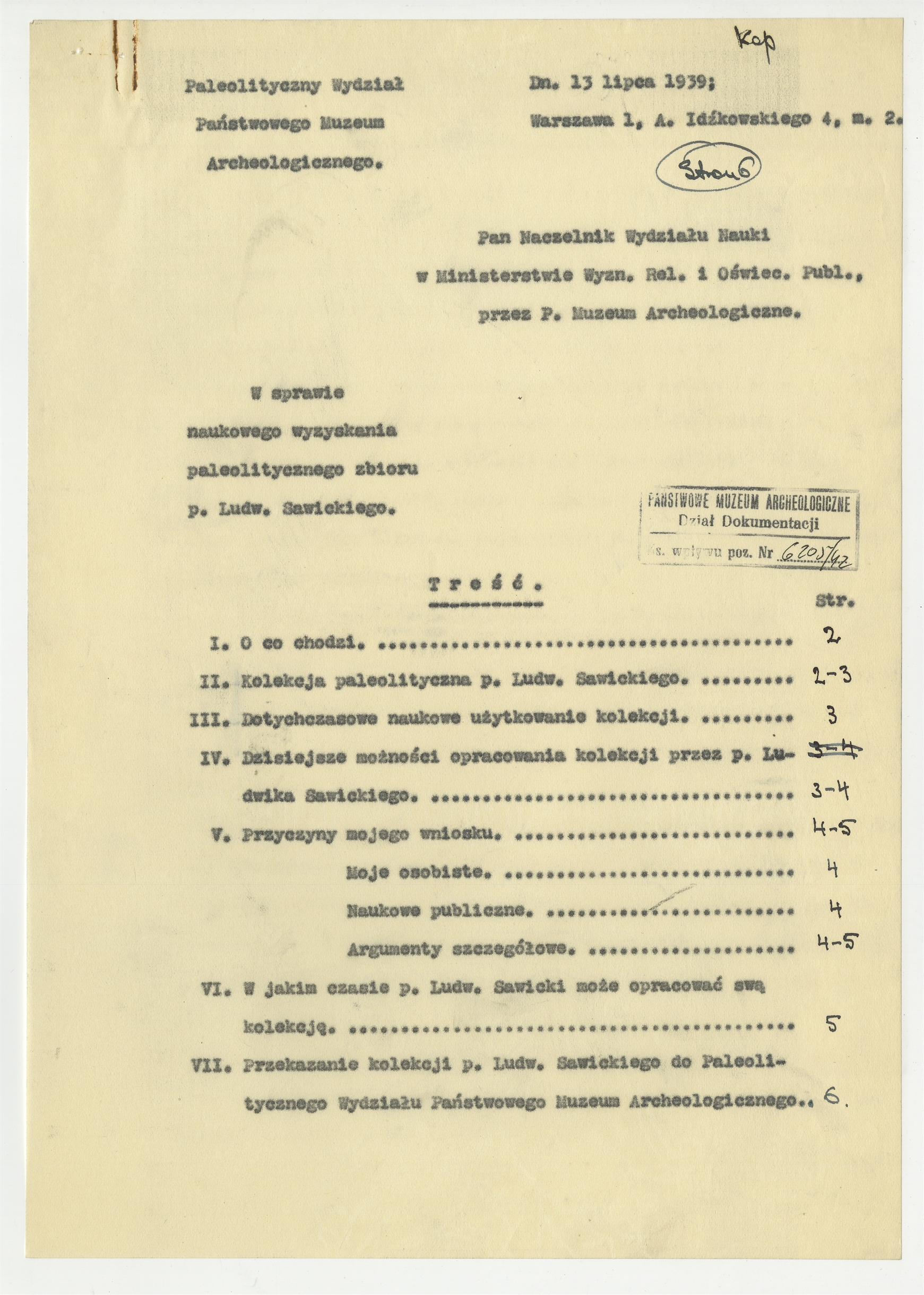 Maszynopis - kopia pisma Stefana Krukowskiego z dnia 13 lipca 1939 roku do Naczelnika Wydziału Nauki Ministerstwa W.R. i O.P. w sprawie zbioru L. Sawickego. Strona 1