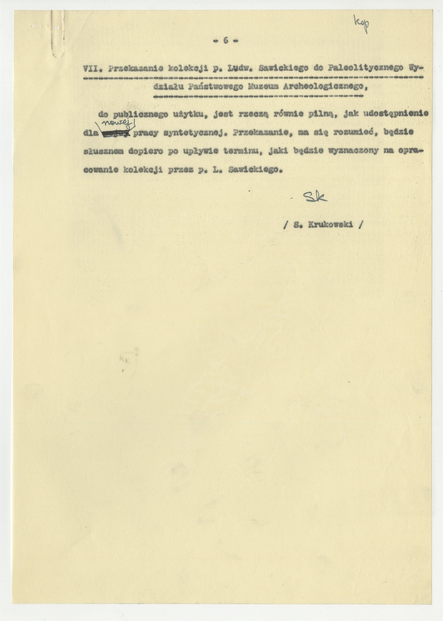 Maszynopis - kopia pisma Stefana Krukowskiego z dnia 13 lipca 1939 roku do Naczelnika Wydziału Nauki Ministerstwa W.R. i O.P. w sprawie zbioru L. Sawickego. Strona 6