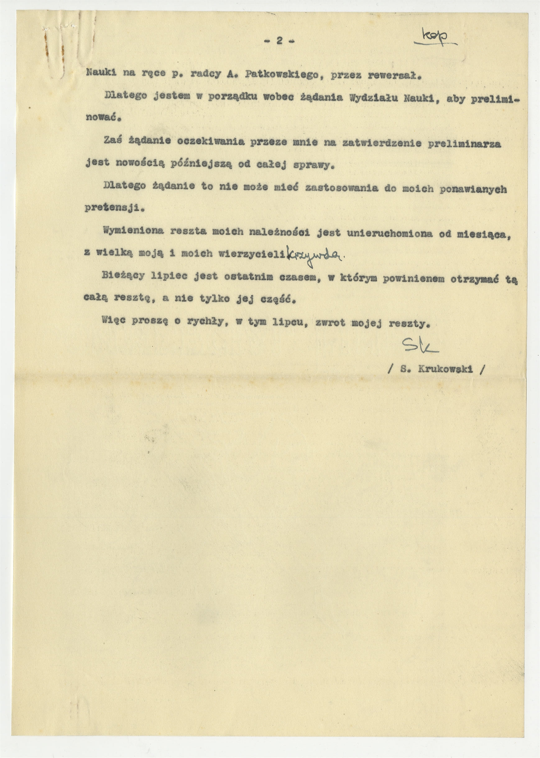 Maszynopis - kopia pisma Stefana Krukowskiego z dnia 17 lipca 1939 roku do Naczelnika Wydziału Nauki Ministerstwa W.R. i O.P. w sprawie zwrotu należności (strona 2)