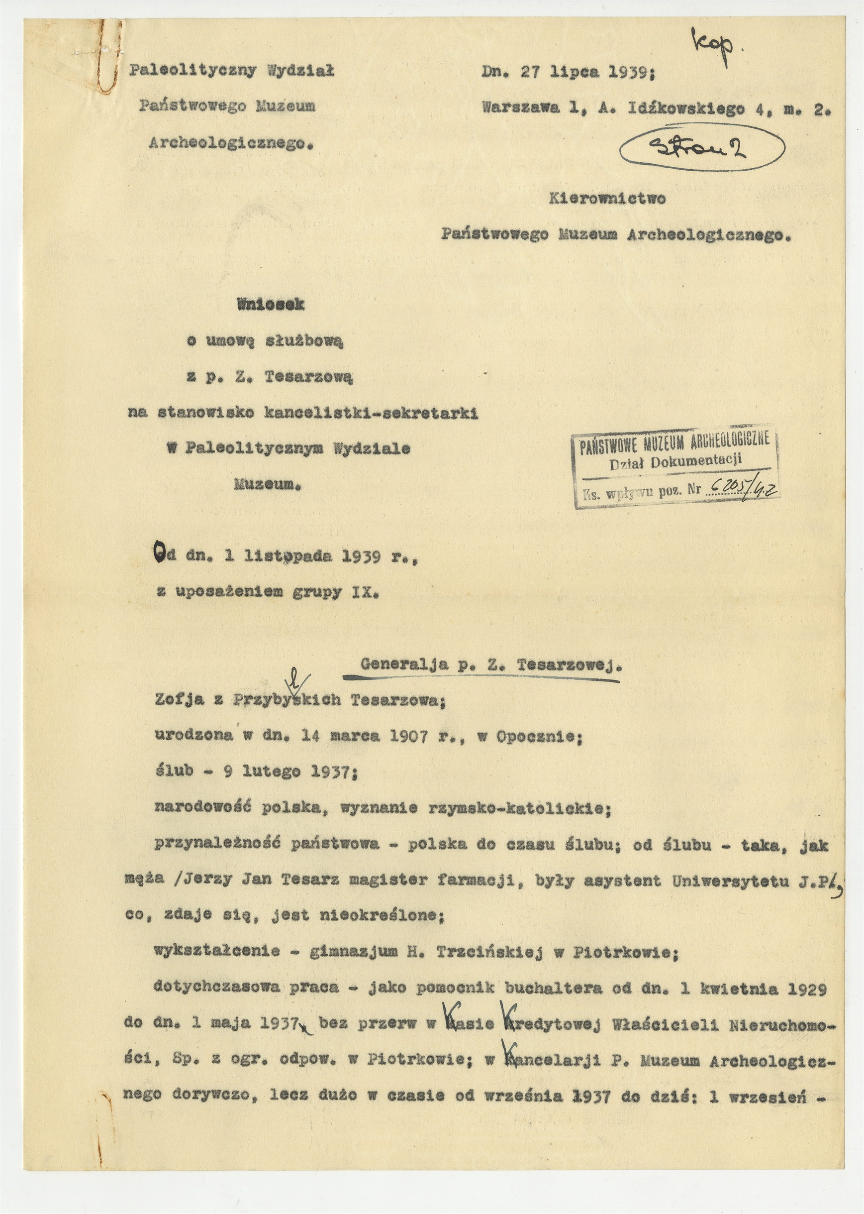 Maszynopis - kopia pisma Stefana Krukowskiego z dnia 27 lipca 1939 roku do Państwowego Muzeum Archeologicznego w sprawie zatrudnienia Z. Tesarzowej