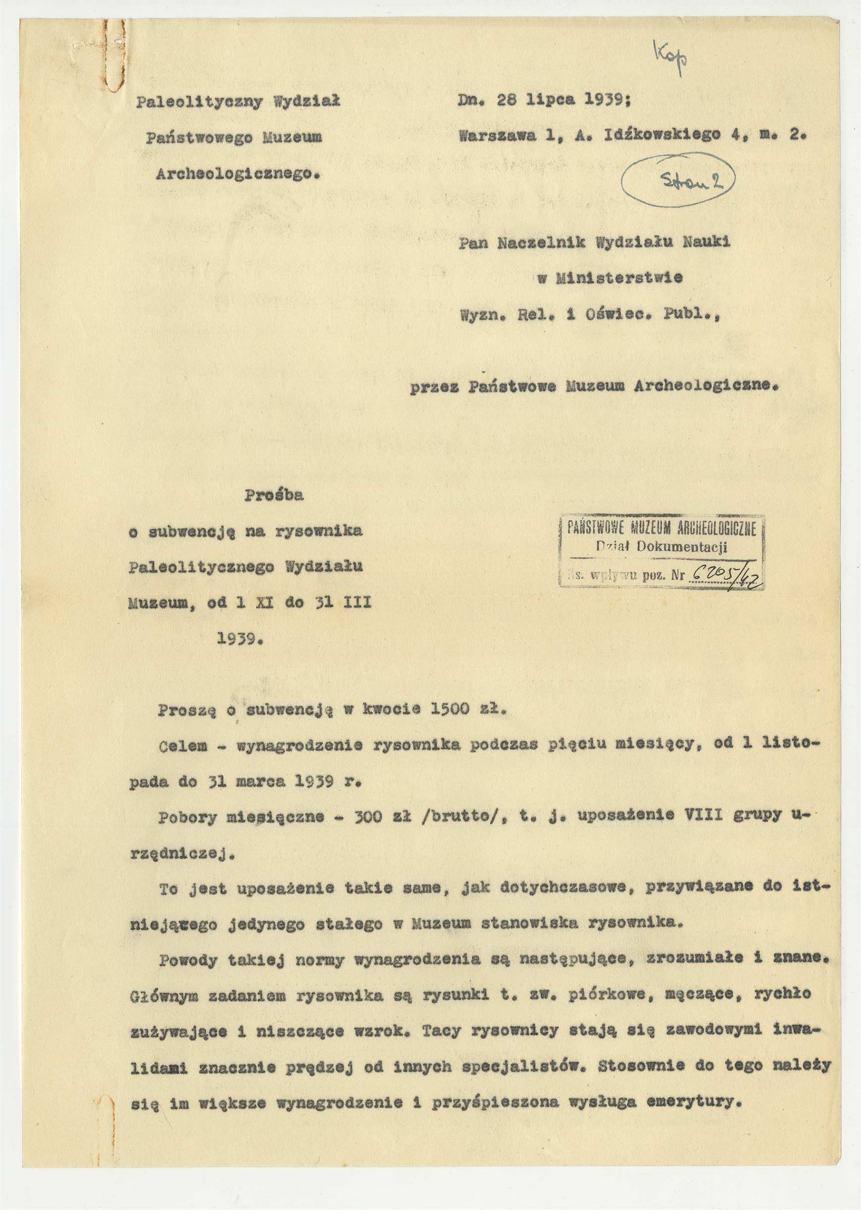 Maszynopis - kopia pisma Stefana Krukowskiego z dnia 28 lipca 1939 roku do Naczelnika Wydziału Nauki Ministerstwa W.R. i O.P. z prośbą o subwencję na rysownika