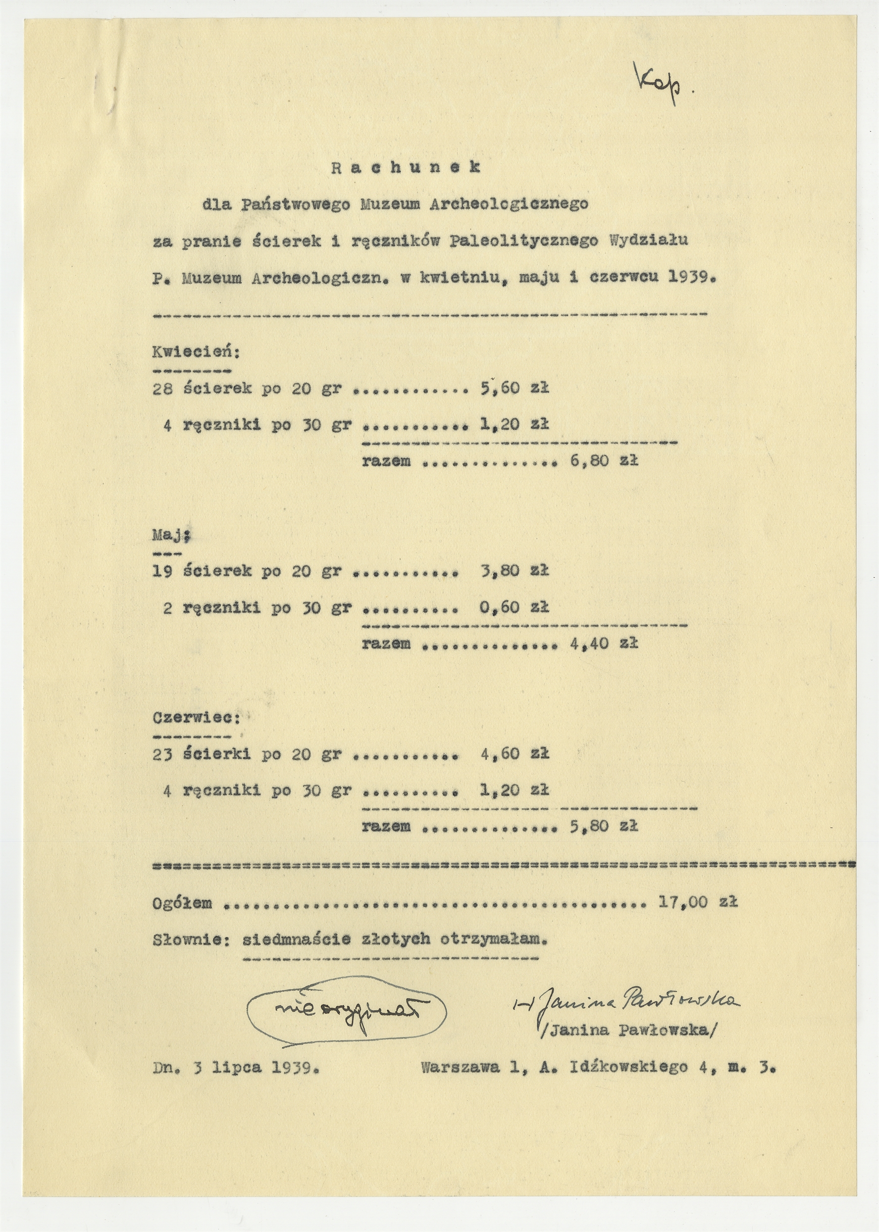 Maszynopis - kopia rachunku dla PMA z dnia 3 lipca 1939 roku za upranie ścierek i recników dla Paleolitycznego Wydziału PMA